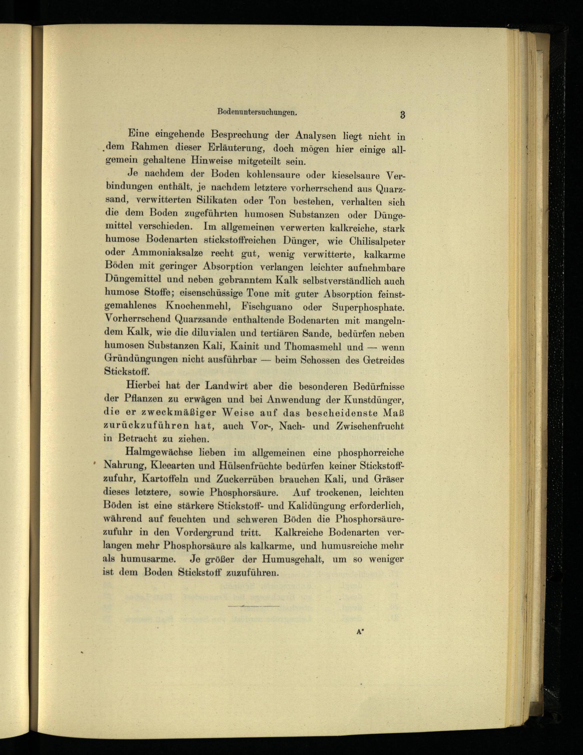 Halmgewächse lieben im ‚allgemeinen eine phosphorreiche Nahrung, Kleearten und Hülsenfrüchte bedürfen keiner Stickstoffzufuhr, Kartoffeln und Zuckerrüben brauchen Kali, und Gräser dieses letztere, sowie Phosphorsäure. Auf trockenen, leichten Böden ist eine stärkere Stickstoff- und Kalidüngung erforderlich, während auf feuchten und schweren Böden die Phosphorsäurezufuhr in den Vordergrund tritt. Kalkreiche Bodenarten verlangen mehr Phosphorsäure als kalkarme, und humusreiche mehr als humusarme. Je größer der Humusgehalt, um so weniger ist dem Boden Stickstoff zuzuführen.