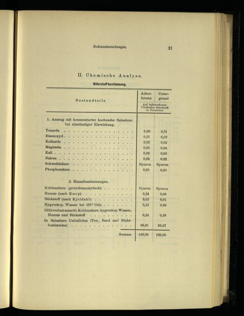 Kohlensäure(gewichtsanalytisch)....... Spuren| Spuren Humus(nach Knop)........... 0,24| 0,08 Stickstoff(nach Kjeldahl)......... 0,02 0,01 Hygroskop. Wasser bei 105° Cels........ 0,13| 0,09 Glühverlust ausschl. Kohlensäure, hygroskop. Wasser,