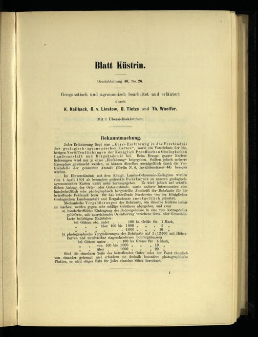 Im Einverständnis mit dem Königl. Landes-Oekonomie-Kollegium werden vom 1. April 1901 ab besondere gedruckte Bohrkarten zu unseren geologischagronomischen Karten nicht mehr herausgegeben. Ks wird jedoch auf schriftlichen Antrag der Orts- oder Gutsvorstände, sowie anderer Interessenten eine handschriftlich oder photographisch hergestellte Abschrift der Bohrkarte für die betreffende Feldmark bezw. für das betreffende Forstrevier von der Königlichen Geologischen Landesanstalt und Bergakademie unentgeltlich geliefert.