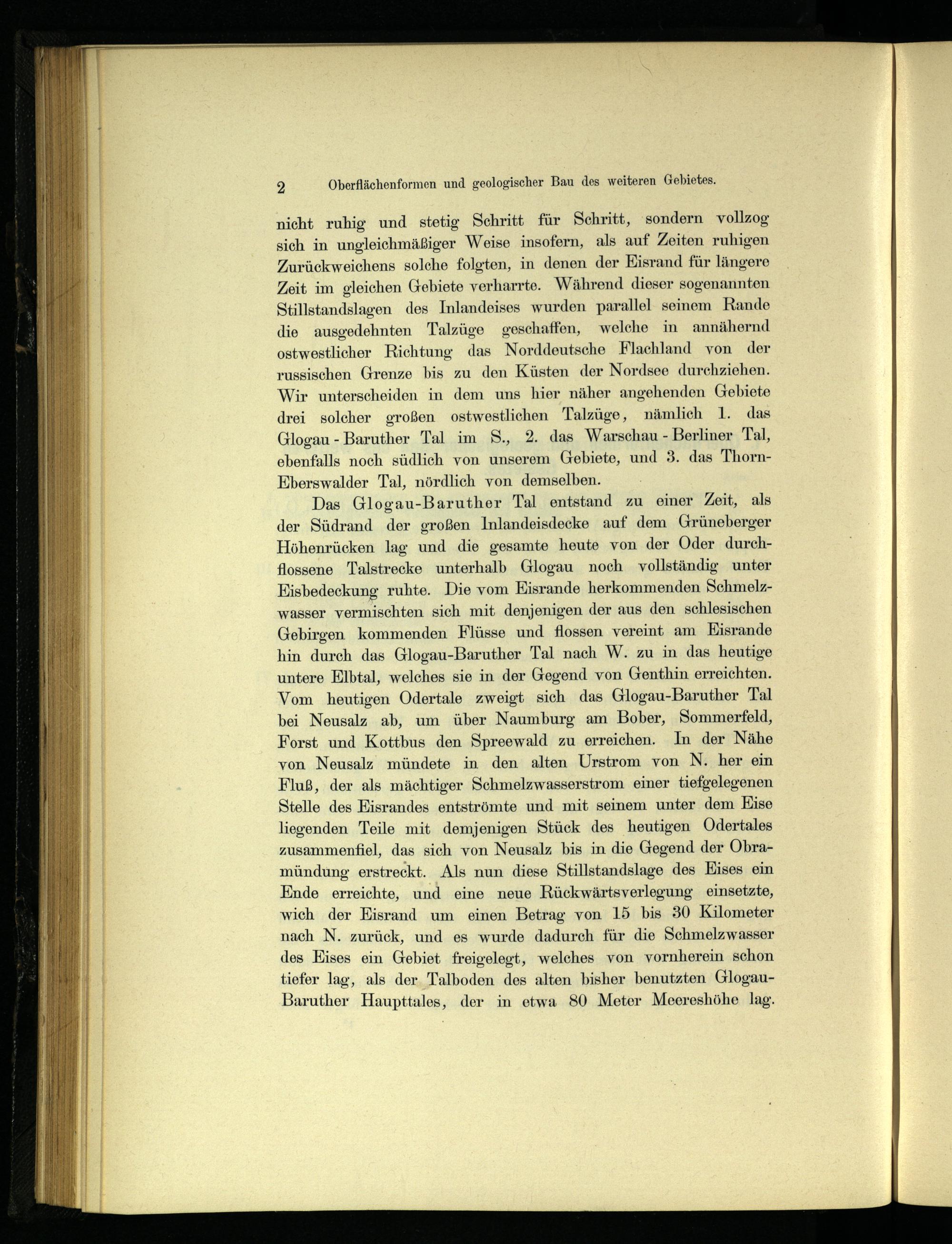 Das Glogau -Baruther Tal entstand zu einer Zeit, als der Südrand der großen Inlandeisdecke auf dem Grüneberger Höhenrücken lag und die gesamte heute von der Oder durchflossene Talstrecke unterhalb Glogau noch vollständig unter Eisbedeckung ruhte. Die vom Eisrande herkommenden Schmelzwasser vermischten sich mit denjenigen der aus den schlesischen Gebirgen kommenden Flüsse und flossen vereint am Kisrande hin durch das Glogau -Baruther Tal nach W. zu in das heutige untere Elbtal, welches sie in der Gegend von Genthin erreichten. Vom heutigen Odertale zweigt sich das Glogau -Baruther Tal bei Neusalz ab, um über Naumburg am Bober, Sommerfeld, Forst und Kottbus den Spreewald zu erreichen. In der Nähe von Neusalz mündete in den alten Urstrom von N. her ein Fluß, der als mächtiger Schmelzwasserstrom einer tiefgelegenen Stelle des Eisrandes entströmte und mit seinem unter dem Kise liegenden Teile mit demjenigen Stück des heutigen Odertales zusammenfiel, das sich von Neusalz bis in die Gegend der Obramündung erstreckt. Als nun diese Stillstandslage des HKises ein Ende erreichte, und eine neue Rückwärtsverlegung einsetzte, wich der Eisrand um einen Betrag von 15 bis 30 Kilometer nach N. zurück, und es wurde dadurch für die Schmelzwasser des Eises ein Gebiet freigelegt, welches von vornherein schon tiefer lag, als der Talboden des alten bisher benutzten GlogauBaruther Haupttales, der in etwa S0 Meter Meereshöhe lag.