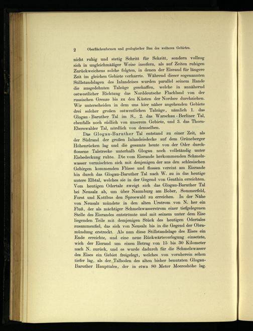 nicht ruhig und stetig Schritt für Schritt, sondern vollzog sich in ungleichmäßiger Weise insofern, als auf Zeiten ruhigen Zurückweichens solche folgten, in denen der Eisrand für längere Zeit im gleichen Gebiete verharrte. Während dieser sogenannten Stillstandslagen des Inlandeises wurden parallel seinem Rande die ausgedehnten Talzüge geschaffen, welche in annähernd ostwestlicher Richtung das Norddeutsche Flachland von der russischen Grenze bis zu den Küsten der Nordsee durchziehen. Wir unterscheiden in dem uns hier näher angehenden Gebiete drei solcher großen ostwestlichen Talzüge, nämlich 1. das Glogau - Baruther Tal im S., 2. das Warschau - Berliner Tal, ebenfalls noch südlich von unserem Gebiete, und 3. das ThornEberswalder Tal, nördlich von demselben.