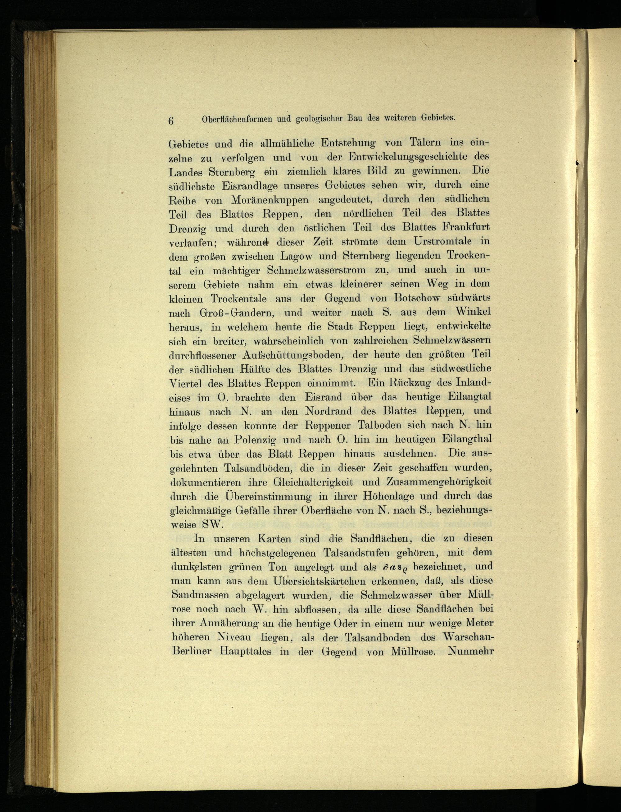 Gebietes und die allmähliche Entstehung von Tälern ins einzelne zu verfolgen und von der Entwickelungsgeschichte des Landes Sternberg ein ziemlich klares Bild zu gewinnen. Die südlichste Eisrandlage unseres Gebietes sehen wir, durch eine Reihe von Moränenkuppen angedeutet, durch den südlichen Teil des Blattes Reppen , den nördlichen Teil des Blattes Drenzig und durch den östlichen Teil des Blattes Frankfurt verlaufen; während dieser Zeit strömte dem Urstromtale in dem großen zwischen Lagow und Sternberg liegenden Trockental ein mächtiger Schmelzwasserstrom zu, und auch in unserem Gebiete nahm ein etwas kleinerer seinen Weg in dem kleinen Trockentale aus der Gegend von Botschow südwärts nach Groß-Gandern, und weiter nach S. aus dem Winkel heraus, in welchem heute die Stadt Reppen liegt, entwickelte sich ein breiter, wahrscheinlich von zahlreichen Schmelzwässern durchflossener Aufschüttungsboden, der heute den größten Teil der südlichen Hälfte des Blattes Drenzig und das südwestliche Viertel des Blattes Reppen einnimmt. Ein Rückzug des Inlandeises im O. brachte den KEisrand über das heutige KEilangtal hinaus nach N. an den Nordrand des Blattes Reppen , und infolge dessen konnte der Reppener Talboden sich nach N. hin bis nahe an Polenzig und nach O. hin im heutigen Eilangthal bis etwa über das Blatt Reppen ‚hinaus ausdehnen. Die ausgedehnten Talsandböden, die in dieser Zeit geschaffen wurden, dokumentieren ihre Gleichalterigkeit und Zusammengehörigkeit durch die Übereinstimmung in ihrer Höhenlage und durch das gleichmäßige Gefälle ihrer Oberfläche von N. nach S., beziehungsweise SW.