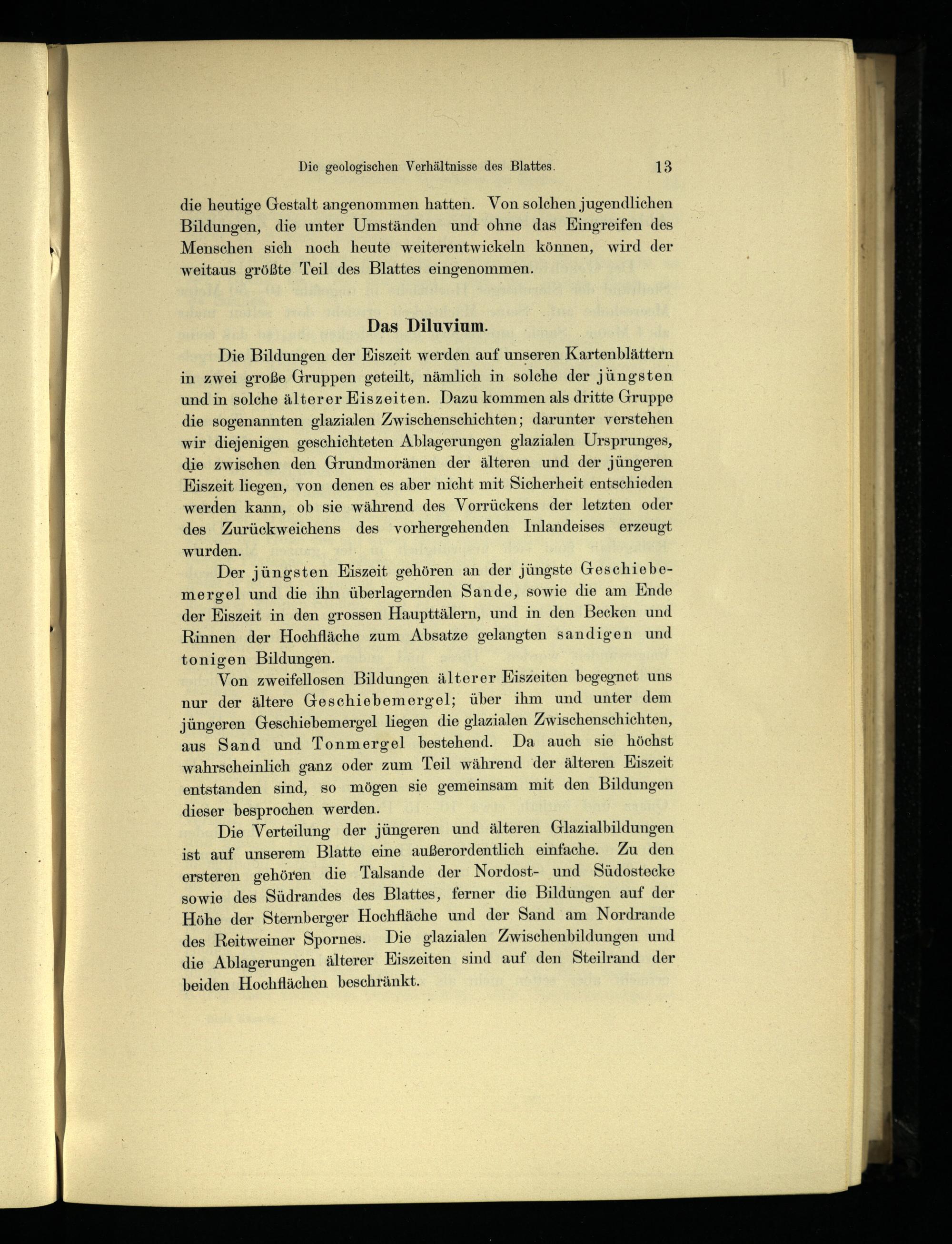 Die Bildungen der Eiszeit werden auf unseren Kartenblättern in zwei große Gruppen geteilt, nämlich in solche der jüngsten und in solche älterer Eiszeiten. Dazu kommen als dritte Gruppe die sogenannten glazialen Zwischenschichten; darunter verstehen wir diejenigen geschichteten Ablagerungen glazialen Ursprunges, die zwischen den Grundmoränen der älteren und der jüngeren Eiszeit liegen, von denen es aber nicht mit Sicherheit entschieden werden kann, ob sie während des Vorrückens der letzten oder des Zurückweichens des vorhergehenden Inlandeises erzeugt wurden.