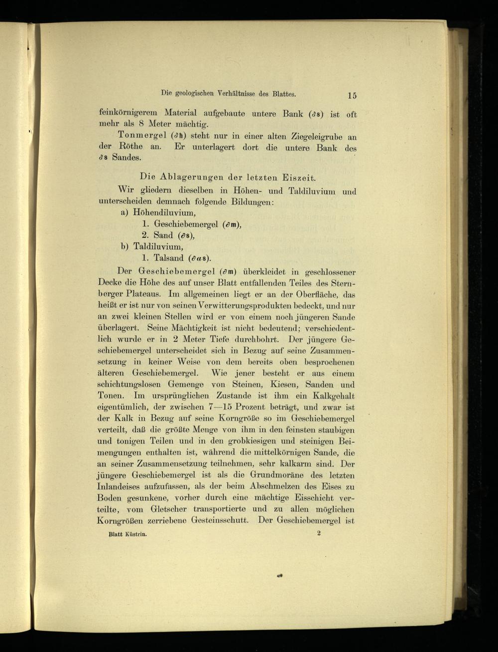 Wir gliedern dieselben in Höhen- und Taldiluvium und unterscheiden demnach folgende Bildungen: a) Höhendiluvium, 1. Geschiebemergel(öm), 2. Sand(ös), b) Taldiluvium, 1. Talsand(0as).