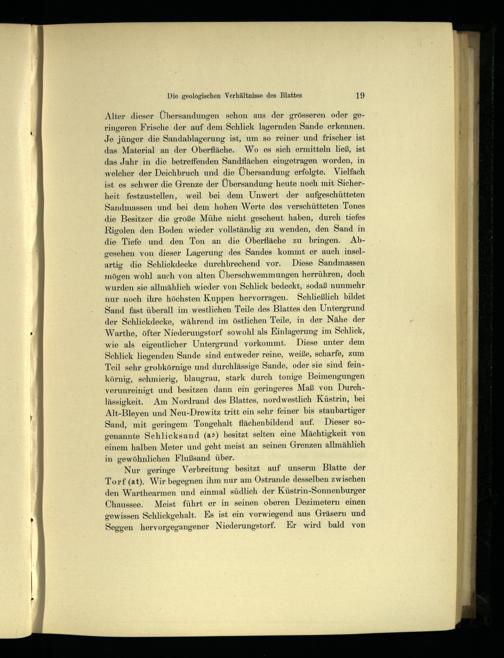Nur geringe Verbreitung besitzt auf unserm Blatte der Torf(at). Wir begegnen ihm nur am Ostrande desselben zwischen den Warthearmen und einmal südlich der Küstrin -Sonnenburger Chaussee. Meist führt er in seinen oberen Dezimetern einen gewissen Schlickgehalt. Es ist ein vorwiegend aus Gräsern und Seggen hervorgegangener Niederungstorf. Er wird bald von