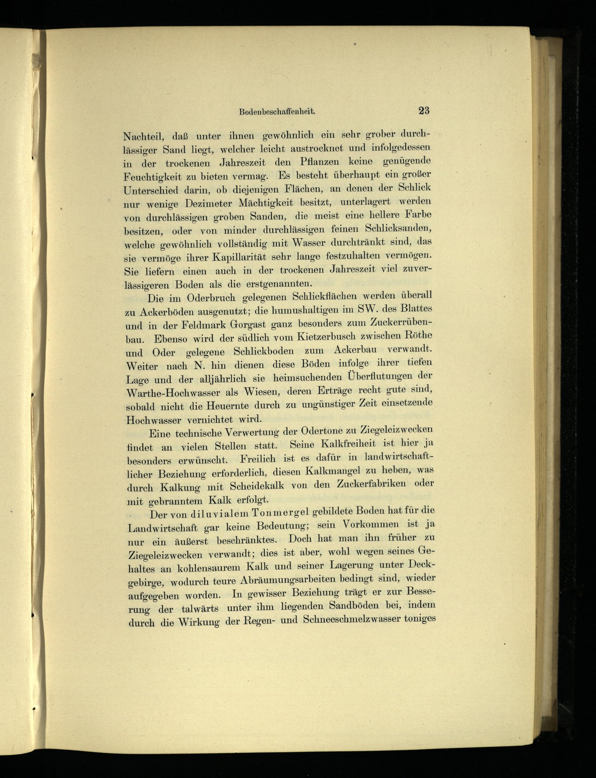 Der von diluvialem Tonmergel gebildete Boden hat für die Landwirtschaft gar keine Bedeutung; sein Vorkommen ist ja nur ein äußerst beschränktes. Doch hat man ihn früher zu Ziegeleizwecken verwandt; dies ist aber, wohl wegen seines Gehaltes an kohlensaurem Kalk und seiner Lagerung unter Deckgebirge, wodurch teure Abräumungs ‚arbeiten. bedingt sind, wieder aufgegeben worden. In gewisser Beziehung trägt er zur Besserung der talwärts unter ihm liegenden Sandböden bei, indem durch die Wirkung der Regen- und Schneeschmelzwasser toniges