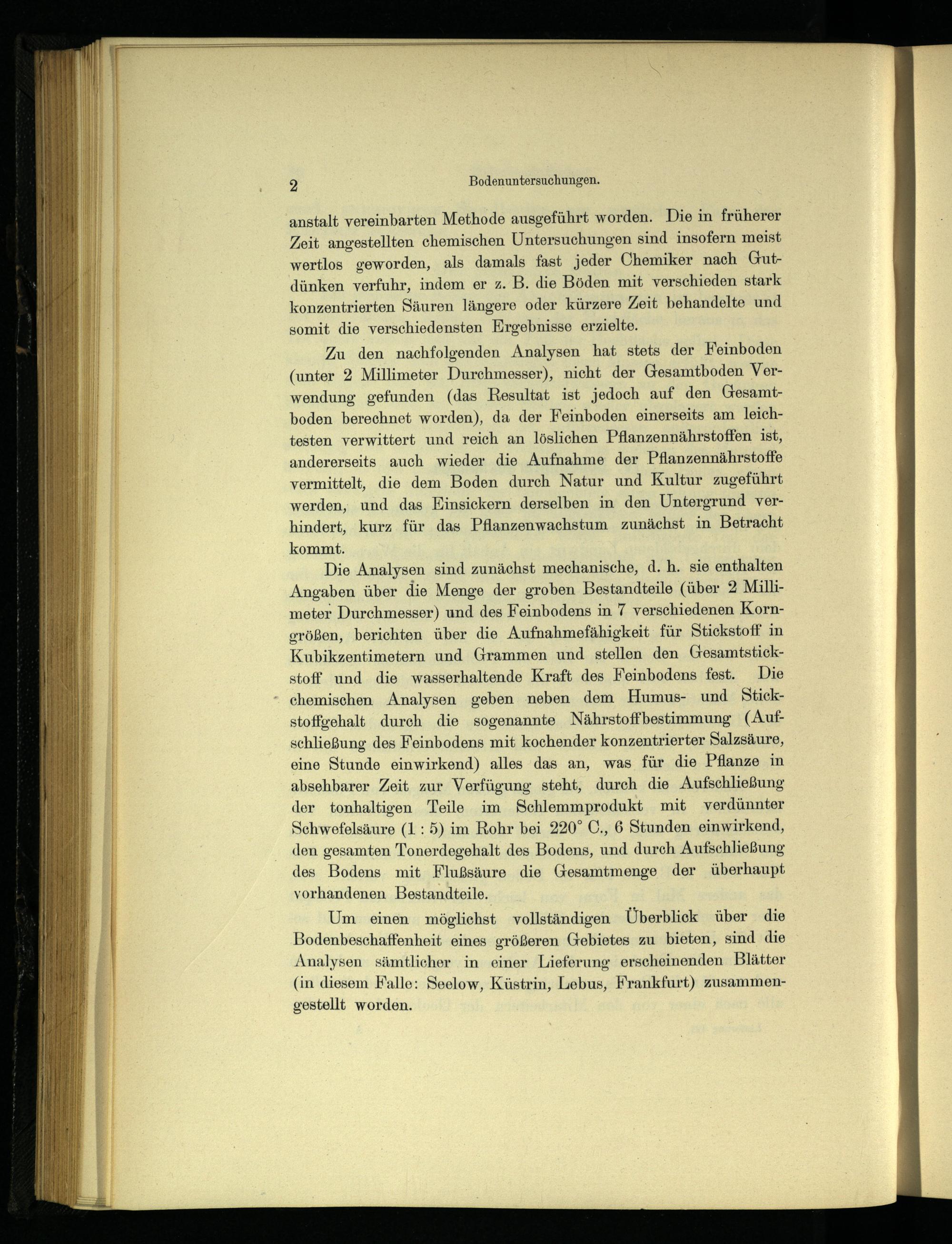 Zu den nachfolgenden Analysen hat stets der Feinboden (unter 2 Millimeter Durchmesser), nicht der Gesamtboden Verwendung gefunden(das Resultat ist jedoch auf den Gesamtboden berechnet worden), da der Feinboden einerseits am leichtesten verwittert und reich an löslichen Pflanzennährstoffen ist, andererseits auch wieder die Aufnahme der Pflanzennährstoffe vermittelt, die dem Boden durch Natur und Kultur zugeführt werden, und das Einsickern derselben in den Untergrund verhindert, kurz für das Pflanzenwachstum zunächst in Betracht kommt.