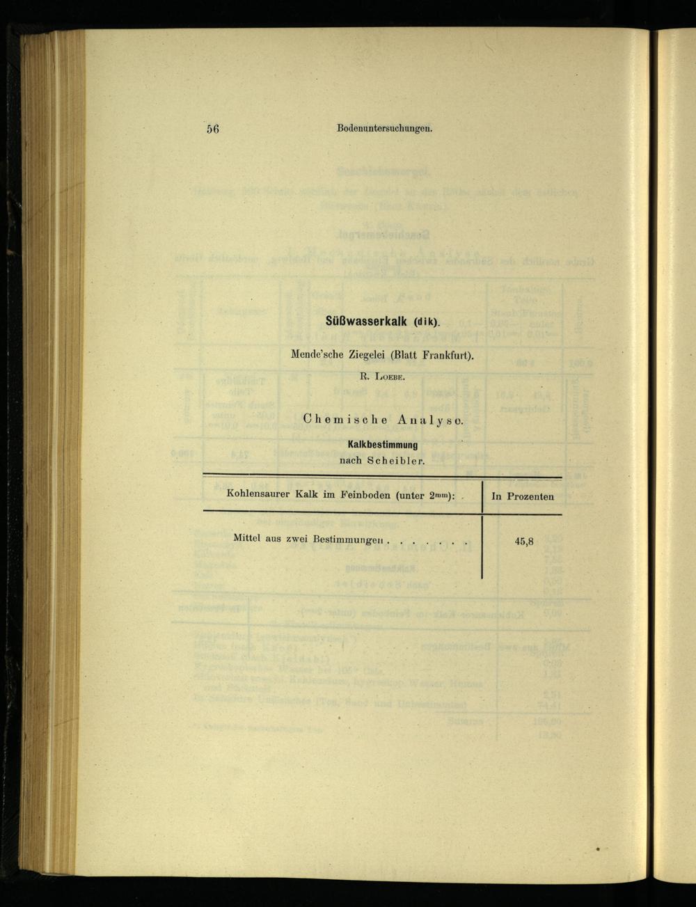 Bodenuntersuchungen. Süßwasserkalk(dik). Mende’sche Ziegelei(Blatt Frankfurt ). R. Loge. Chemische Analyse. Kalkbestimmung nach Scheibler. Kohlensaurer Kalk im Feinboden(unter 2mm);, In Prozenten A DO. Mittel aus zwei Bestimmungen.