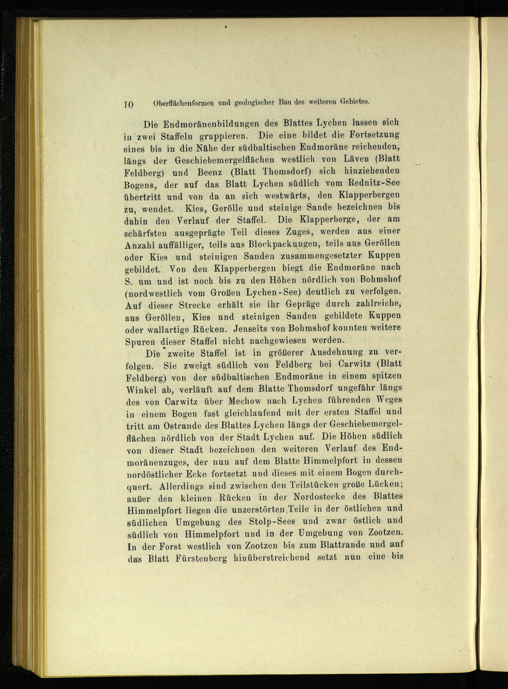 Die Endmoränenbildungen des Blattes Lychen lassen sich in zwei Staffeln gruppieren. Die eine bildet die Fortsetzung eines bis in die Nähe der südbaltischen Endmoräne reichenden, längs der Geschiebemergelflächen westlich von Läven(Blatt Feldberg) und Beenz(Blatt Thomsdorf). sich hinziehenden Bogens, der auf das Blatt Lychen südlich vom Rednitz -See übertritt und von da.an sich westwärts, den Klapperbergen zu, wendet. Kies, Gerölle und steinige Sande bezeichnen bis dahin den Verlauf der Staffel. Die Klapperberge, der am schärfsten ausgeprägte Teil dieses Zuges, werden aus einer Anzahl auffälliger, teils aus Blockpackungen, teils aus Geröllen oder Kies und steinigen. Sanden zusammengesetzter Kuppen gebildet. Von den Klapperbergen biegt die Endmoräne nach S. um und ist noch bis zu den Höhen nördlich von.Bohmshof (nordwestlich vom Großen Lychen -See) deutlich zu verfolgen. Auf dieser Strecke erhält sie ihr Gepräge durch zahlreiche, aus Geröllen, Kies und steinigen Sanden gebildete Kuppen oder wallartige Rücken. Jenseits von Bohmshof konnten weitere Spuren dieser Staffel nicht nachgewiesen werden.