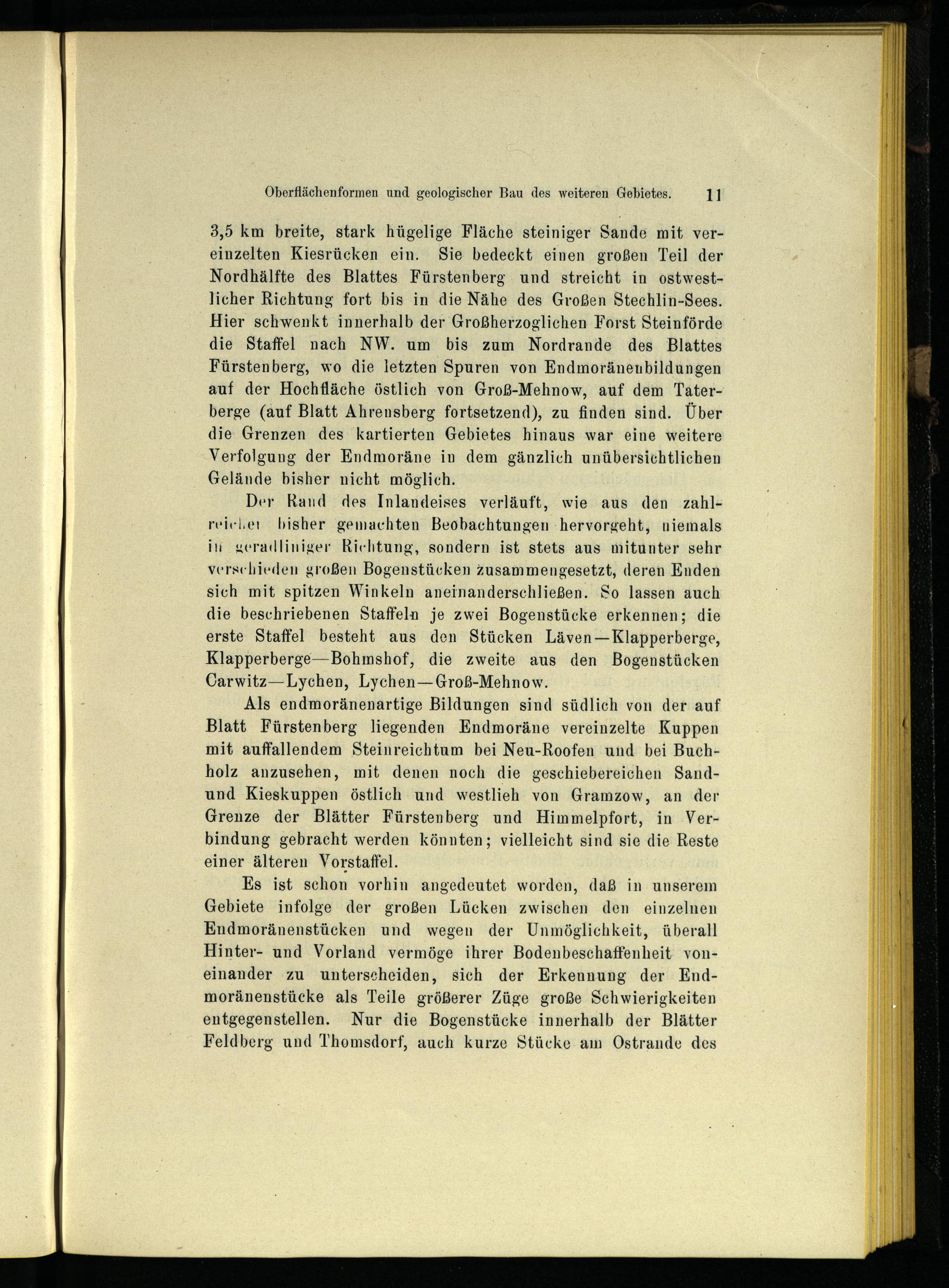 3,5 km breite, stark hügelige Fläche steiniger Sande mit vereinzelten Kiesrücken ein. Sie bedeckt einen großen Teil der Nordhälfte des Blattes Fürstenberg und streicht in ostwestlicher Richtung fort bis in die Nähe des Großen Stechlin -Sees. Hier schwenkt innerhalb der Großherzoglichen Forst Steinförde die Staffel nach NW. um bis zum Nordrande des Blattes Fürstenberg , wo die letzten Spuren von Endmoränenbildungen auf der Hochfläche östlich von Groß-Mehnow, auf dem Taterberge(auf Blatt Ahrensberg fortsetzend), zu finden sind. Über die Grenzen des kartierten Gebietes hinaus war eine weitere Verfolgung der Endmoräne in dem gänzlich unübersichtlichen Gelände bisher nicht möglich.