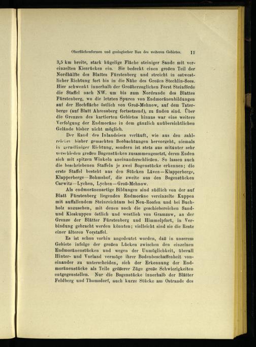 Der Rand des Inlandeises verläuft, wie aus den zahlreicher bisher gemachten Beobachtungen ‚hervorgeht, niemals in geradliniger Richtung, sondern ist stets aus mitunter sehr verschieden großen Bogenstücken zusammengesetzt, deren Enden sich mit spitzen Winkeln aneinanderschließen. So lassen auch die beschriebenen Staffeln je zwei Bogenstücke erkennen; die erste Staffel besteht aus den Stücken Läven—Klapperberge, Klapperberge—Bohmshof, die zweite aus den Bogenstücken Carwitz—Lychen, Lychen—Groß-Mehnow.
