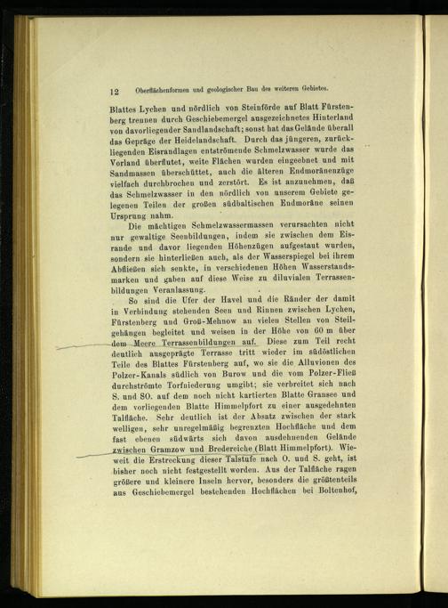 Blattes Lychen und nördlich von Steinförde auf Blatt Fürstenberg trennen durch Geschiebemergel ausgezeichnetes Hinterland von davorliegender Sandlandschaft; sonst hat das Gelände überall das Gepräge der Heidelandschaft. Durch das jüngeren, zurückliegenden Eisrandlagen entströmende Schmelzwasser wurde das Vorland überflutet, weite Flächen wurden eingeebnet und mit Sandmassen überschüttet, auch die älteren Endmoränenzüge vielfach durchbrochen und zerstört. Es ist anzunehmen, daß das Schmelzwasser in den nördlich von unserem Gebiete gelegenen Teilen der großen südbaltischen Endmoräne seinen Ursprung nahm.);