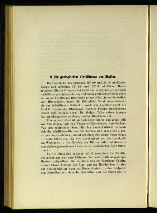 Das ganze Gebiet ist vielfach durch kleine und große, teils von Alluvionen, teils von Wasser erfüllte Senken durchlöchert. Von den zahlreichen Seen, die das Landschaftsbild namentlich des nördlichen Blattviertels beleben und ihm einen eigenartigen Reiz verleihen, nimmt der Stolp -See seiner Größe wegen die erste Stelle ein. Er wird durchströmt von der Havel , die am Westrande in den Bereich des Blattes tritt und dieses in mannigfach gewundenem Laufe bis zur südöstlichen Ecke durchquert.