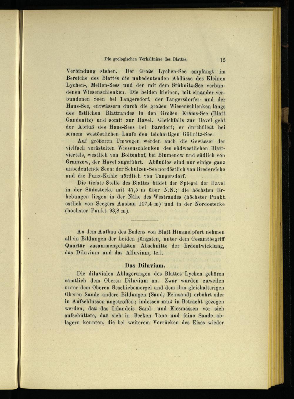 Die diluvialen Ablagerungen des Blattes‘ Lychen gehören sämtlich dem Oberen Diluvium an. Zwar wurden zuweilen unter dem Oberen Geschiebemergel und dem ihm gleichalterigen Oberen Sande andere Bildungen(Sand, Feinsand) erbohrt oder in Aufschlüssen angetroffen; indessen muß in Betracht gezogen werden, daß das Inlandeis Sand- und Kiesmassen vor sich aufschüttete, daß. sich in Becken Tone und feine Sande ablagern konnten, die bei weiterem Vorrücken des Eises wieder