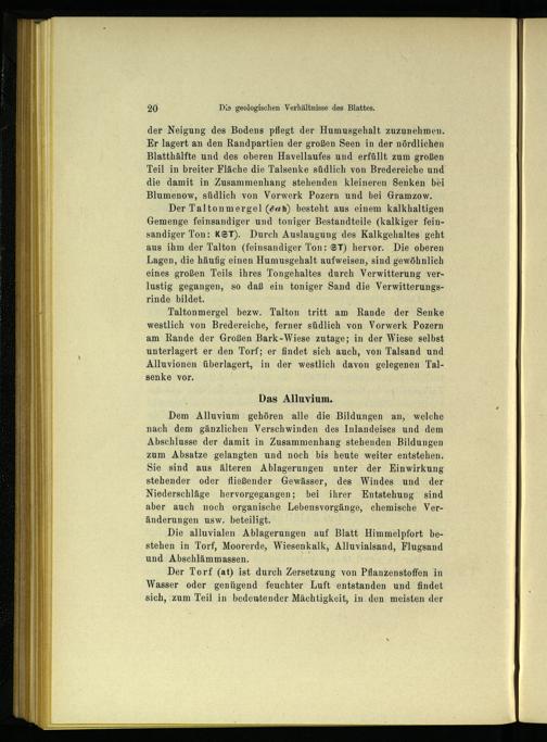 Taltonmergel bezw. Talton tritt am Rande der Senke westlich von Bredereiche , ferner südlich von Vorwerk Pozern am Rande der Großen Bark-Wiese zutage; in der Wiese selbst unterlagert er den Torf; er findet sich auch, von Talsand und Alluvionen überlagert, in der westlich davon gelegenen Talsenke vor.