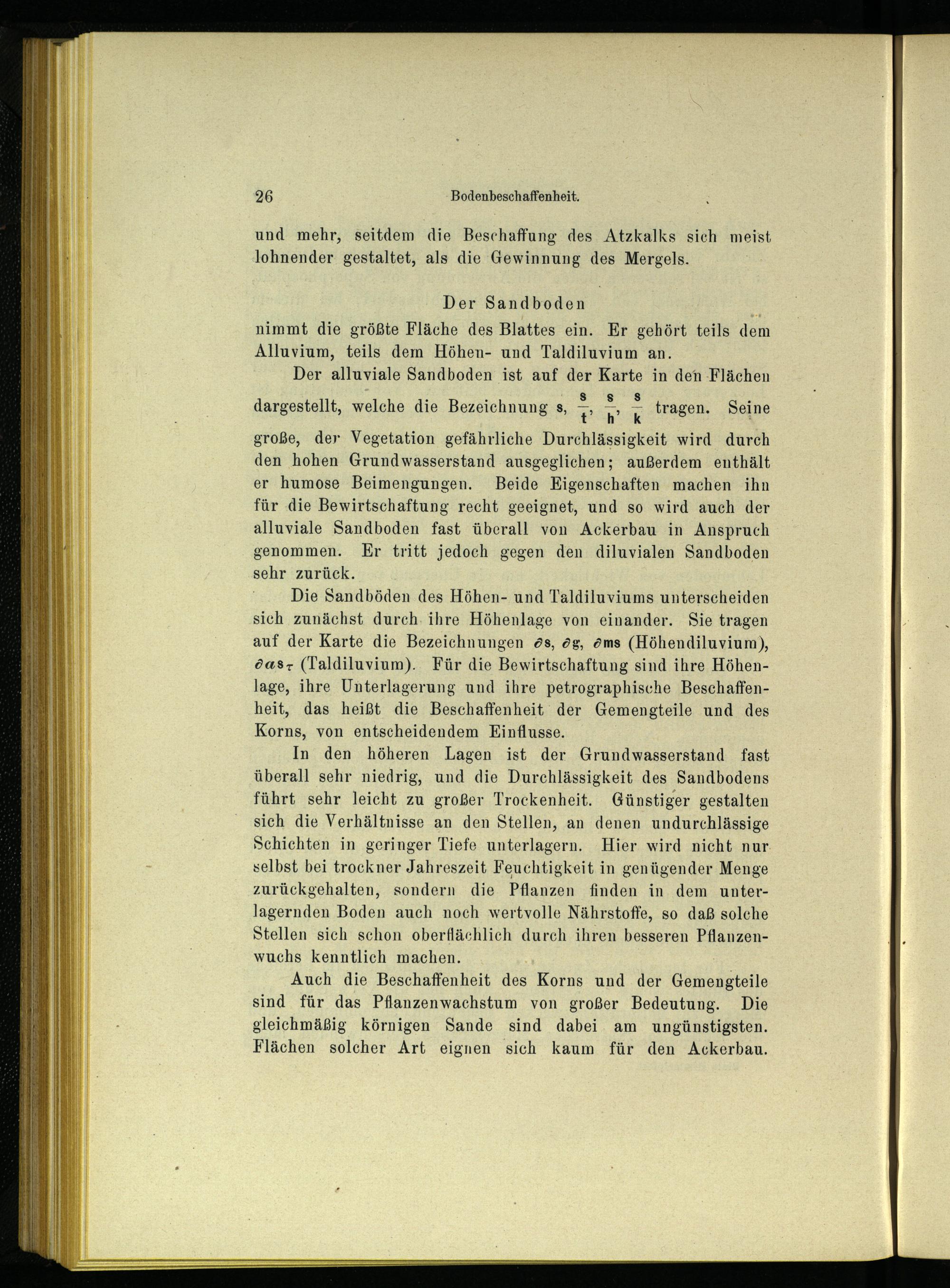 Die Sandböden des Höhen- und Taldiluviums unterscheiden sich zunächst durch. ihre Höhenlage von einander. Sie tragen auf der Karte die Bezeichnungen ös, ög, öms(Höhendiluvium), öas-(Taldiluvium). Für die Bewirtschaftung sind ihre Höhenlage, ihre Unterlagerung und ihre petrographische Beschaffenheit, das heißt die Beschaffenheit der Gemengteile und des Korns, von entscheidendem Einflusse.