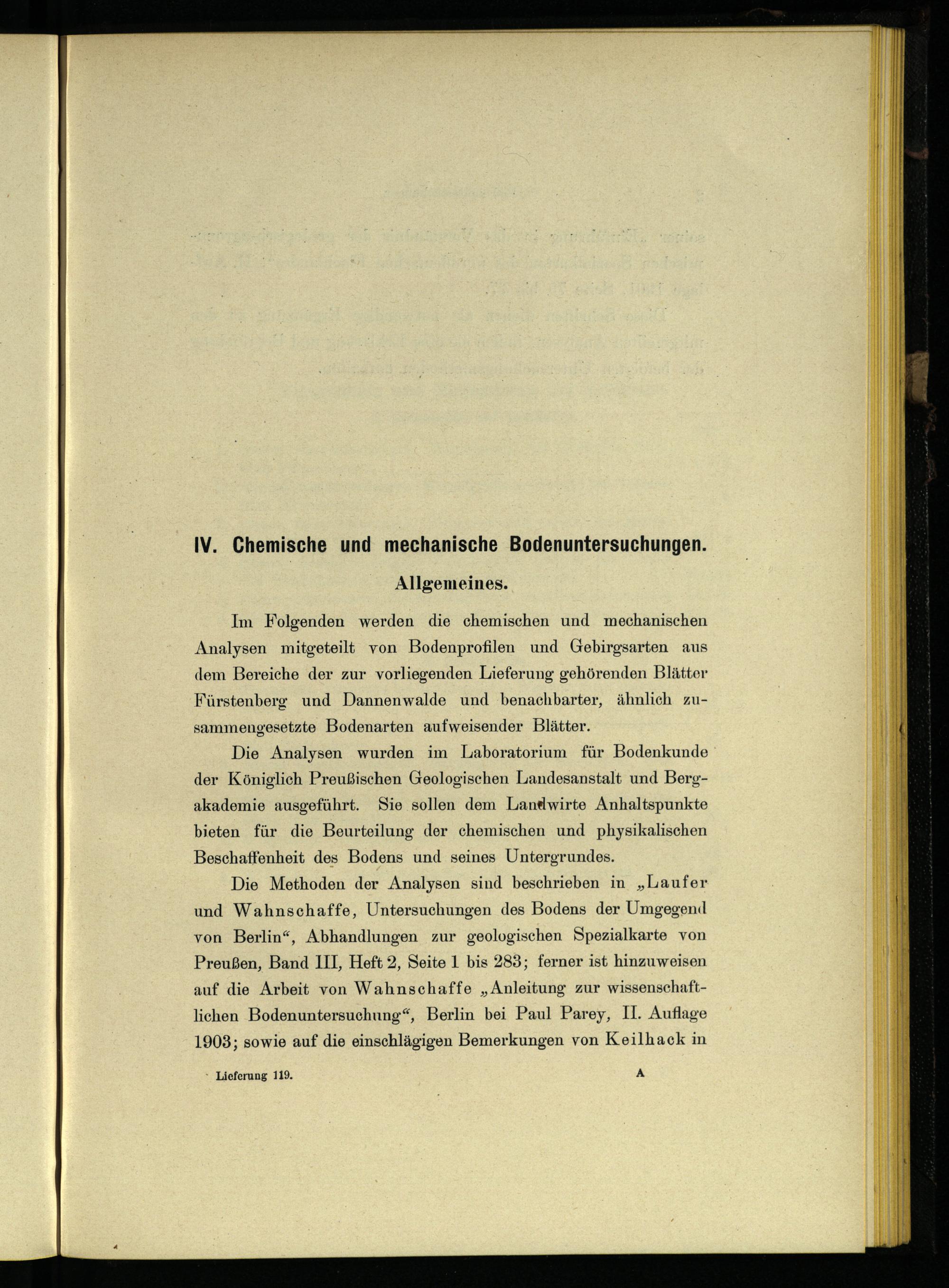 Im Folgenden werden die chemischen und mechanischen Analysen mitgeteilt von Bodenprofilen und Gebirgsarten aus dem Bereiche der zur vorliegenden Lieferung gehörenden Blätter Fürstenberg und Dannenwalde und benachbarter, ähnlich zusammengesetzte Bodenarten aufweisender Blätter.