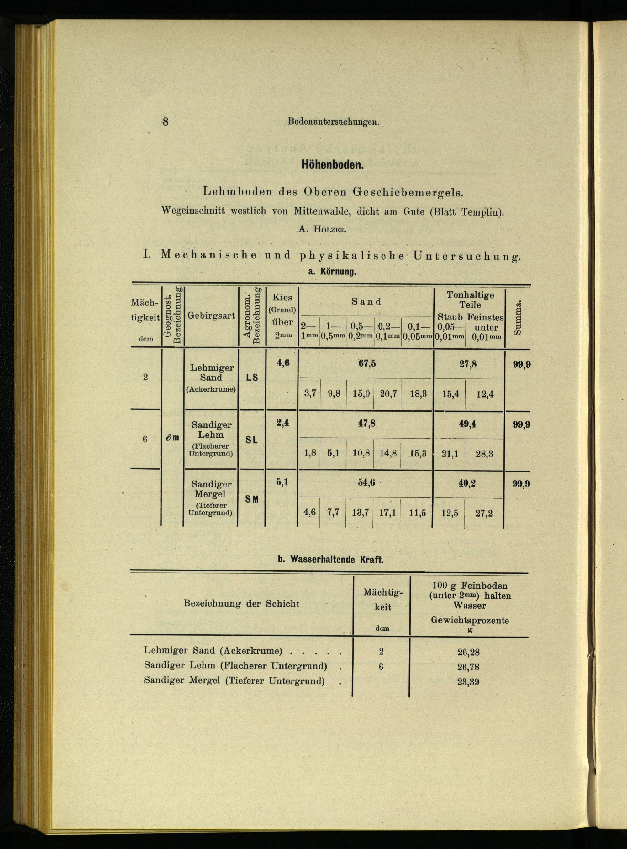 I. Mechanische und physikalische Untersuchung. a. Körnung. Kies Sand Teile f Grand N be) N VEN Er TTT 1 Staub Feinstes über{a| 1[0,5—[0,2—| 0,1-—[0,05—| unter 22mm Tem, ann 0,1mm 0,05mm 0,01mm 0,01mm