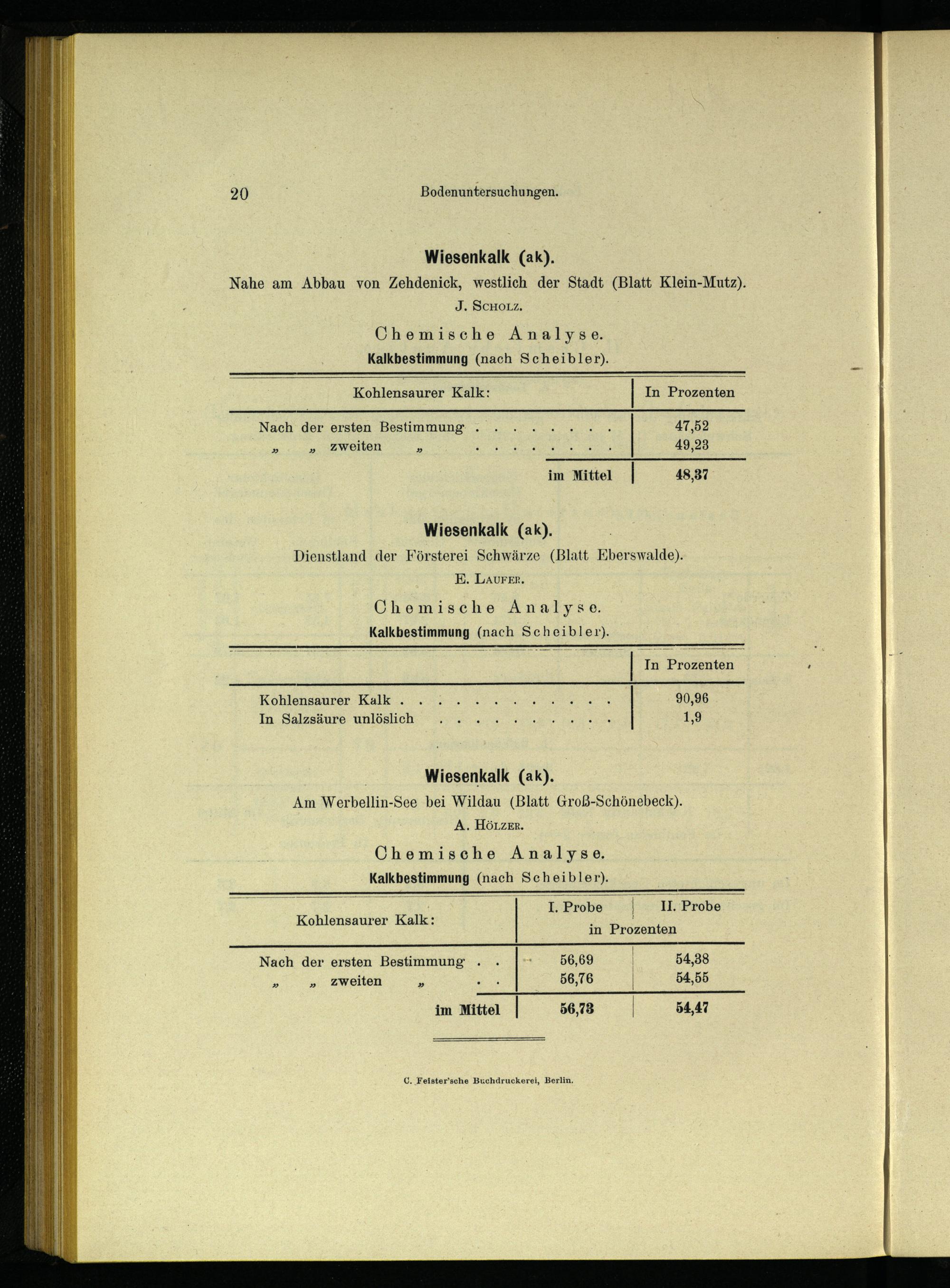 ; Wiesenkalk(ak). Am Werbellin-See bei Wildau (Blatt Groß-Schönebeck). A. Hö1zer. Chemische Analyse. Kalkbestimmung(nach Scheibler).