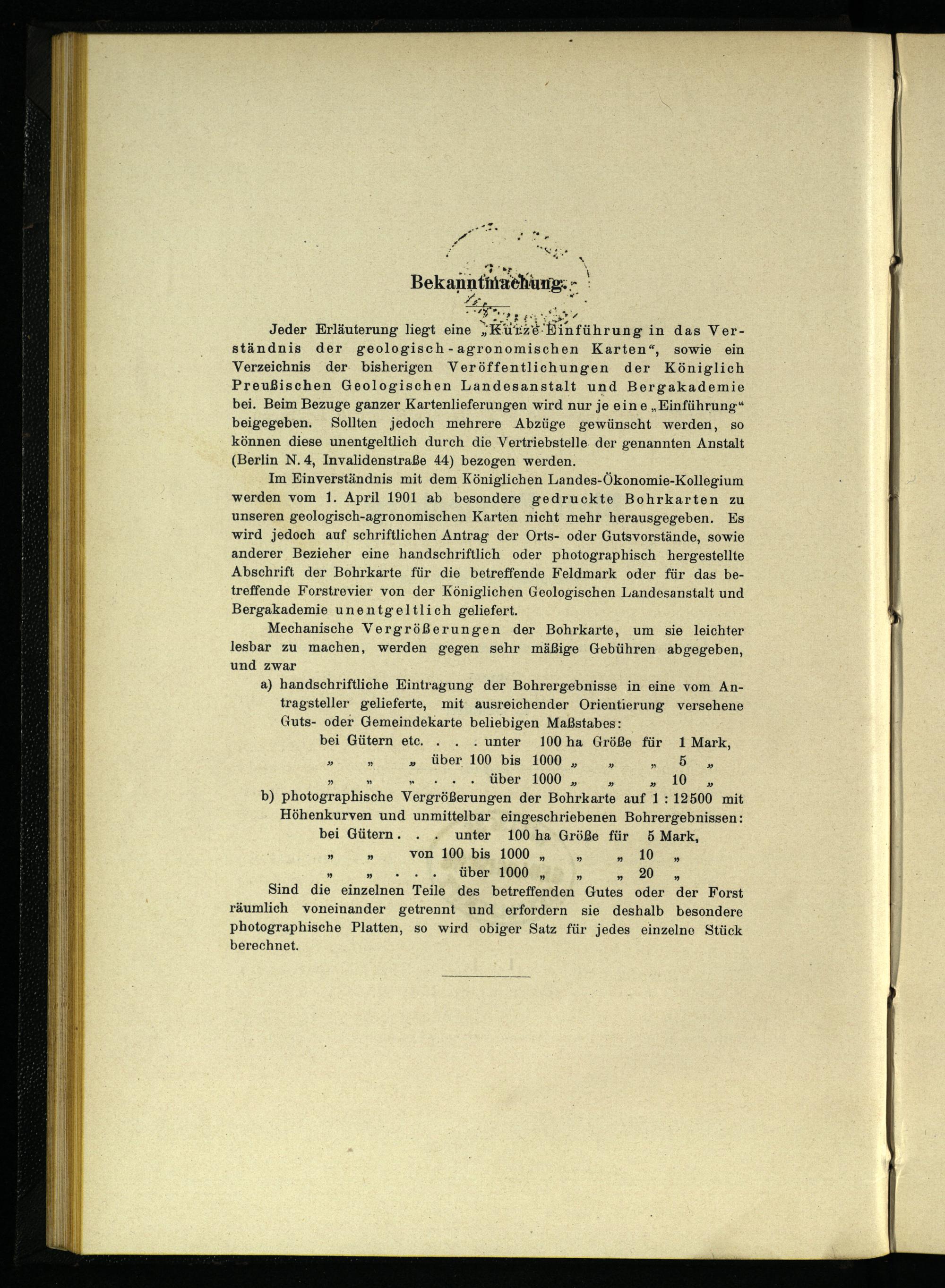 Im Einverständnis mit dem Königlichen Landes-Ökonomie-Kollegium werden vom 1. April 1901 ab besondere gedruckte Bohrkarten zu unseren geologisch-agronomischen Karten nicht mehr herausgegeben. Es wird jedoch auf schriftlichen Antrag der Orts- oder Gutsvorstände, sowie anderer Bezieher eine handschriftlich oder photographisch hergestellte Abschrift der Bohrkarte für die betreffende Feldmark oder für das betreffende Forstrevier von der Königlichen Geologischen Landesanstalt und Bergakademie unentgeltlich geliefert.