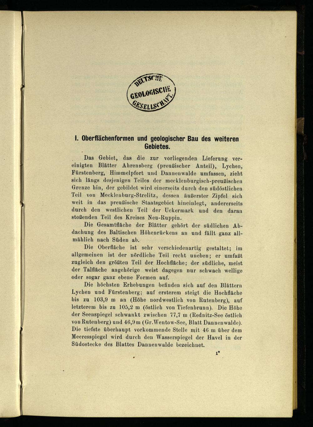 ‚ Das Gebiet, das die zur vorliegenden Lieferung vereinigten Blätter Ahrensberg (preußischer Anteil), Lychen , Fürstenberg , Himmelpfort und Dannenwalde umfassen, zieht sich längs desjenigen Teiles der mecklenburgisch-preußischen Grenze hin, der gebildet wird einerseits durch den südöstlichen Teil von Mecklenburg-Strelitz , dessen äußerster Zipfel sich weit in das preußische Staatsgebiet hineinlegt, andererseits durch den westlichen Teil der Uckermark und den daran stoßenden Teil des Kreises Neu-Ruppin .}