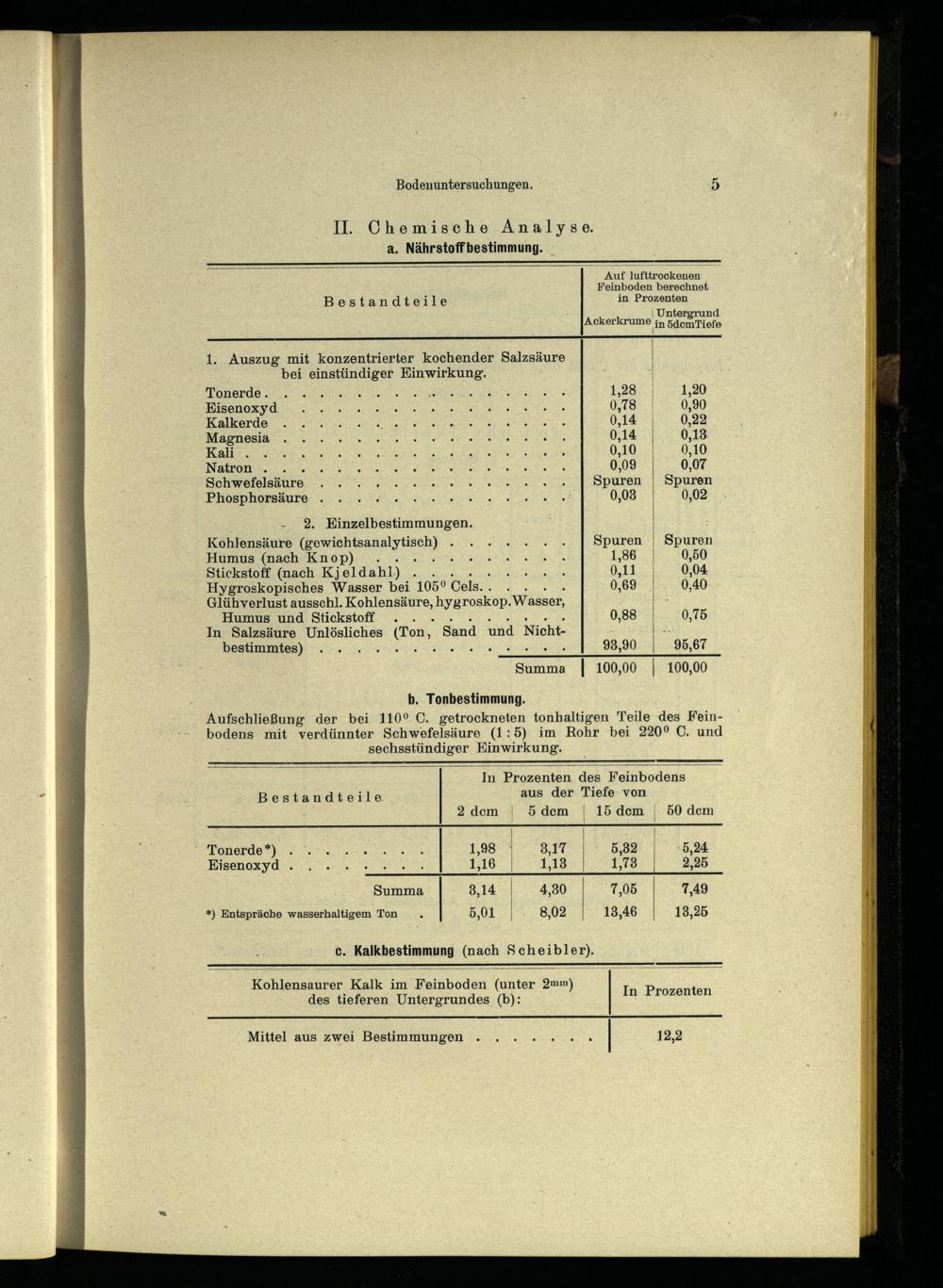 Bestandteile. aus der Tiefe- von 2 dem| 5dem| 15 dem 50 dem Tonerde*). 0... 1,981 817> 589 1 15,24 Eisenoxyd. 16| 113| 178| 285 Summa 8,14| 430| 7,05 7,49 *) Entspräche wasserhaltigem Ton 5,01| 8,02| 13,46 13,25