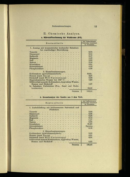 2. Einzelbestimmungen. Kohlensäure(gewichtsanalytisch)...... 0,03 Humus(nach Knop). AR 0,91 Stickstoff(nach Will--Varrentrapp):. 0,05 Glühverlust ausschl.Kohlensäure, hygroskop. Wasser, Humus und Stickstoff... KA. 0,82