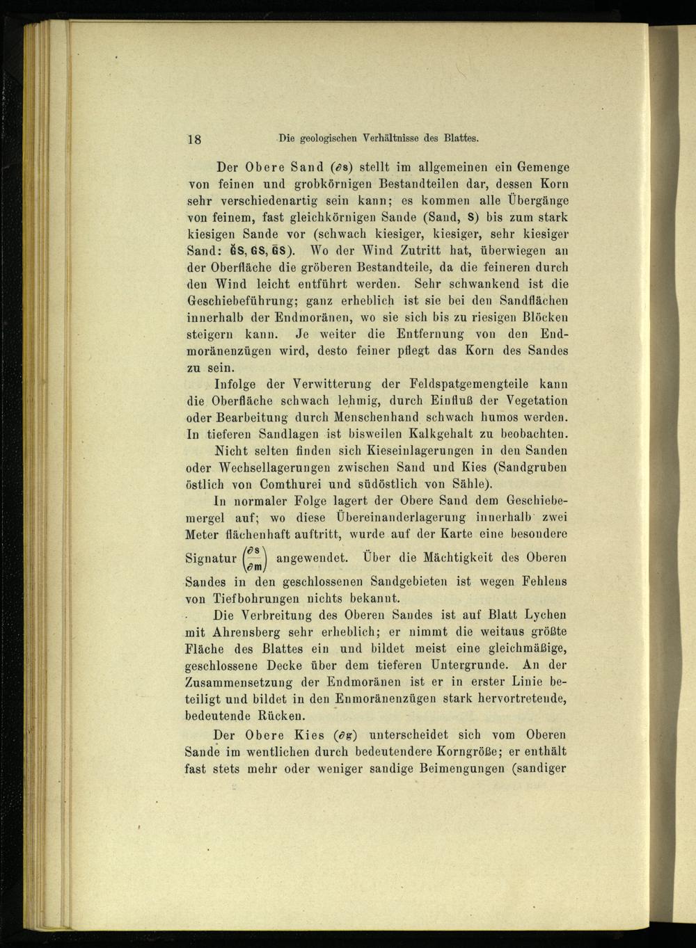 Der Obere Sand(ös) stellt im allgemeinen ein Gemenge von feinen und grobkörnigen Bestandteilen dar, dessen Korn sehr verschiedenartig sein kann; es kommen alle Übergänge von feinem, fast gleichkörnigen Sande(Sand, S) bis zum stark kiesigen Sande vor(schwach kiesiger, kiesiger, sehr kiesiger Sand:&s, GS, GS). Wo der Wind Zutritt hat, überwiegen an der Oberfläche die gröberen Bestandteile, da die feineren durch den Wind leicht entführt werden. Sehr schwankend ist die Geschiebeführung; ganz erheblich ist sie bei den Sandflächen innerhalb der Endmoränen , wo sie sich bis zu riesigen Blöcken steigern. kann. Je weiter die Entfernung von den KEndmoränenzügen wird, desto feiner pflegt das Korn des Sandes zu sein.