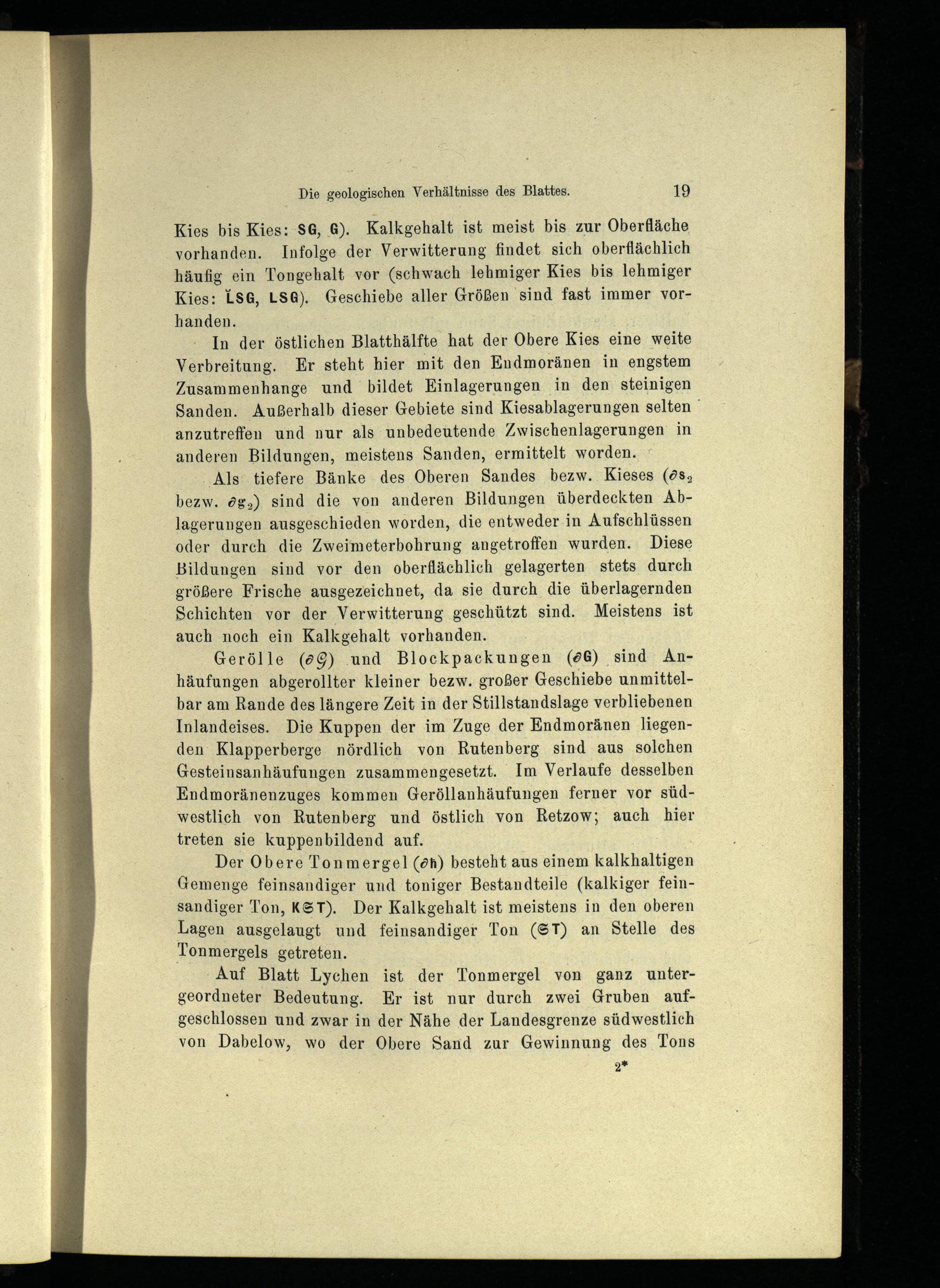 In der östlichen Blatthälfte hat der Obere Kies eine weite Verbreitung. Er steht hier mit den Endmoränen in engstem Zusammenhange und bildet Einlagerungen in den steinigen Sanden. Außerhalb dieser Gebiete sind Kiesablagerungen selten anzutreffen und nur als unbedeutende Zwischenlagerungen’ in anderen Bildungen, meistens Sanden, ermittelt worden.