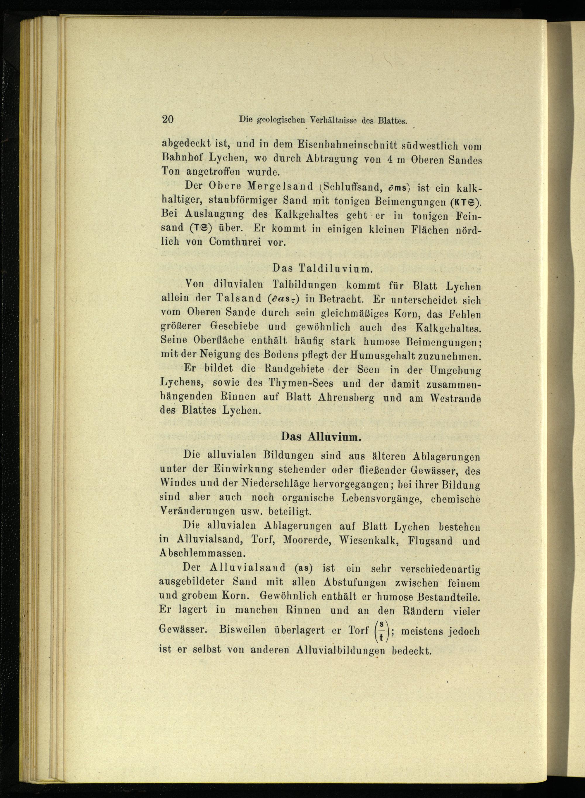 Von diluvialen Talbildungen kommt für Blatt Lychen allein der Talsand(das-) in Betracht. Er unterscheidet sich vom Oberen Sande durch sein gleichmäßiges Korn, das Fehlen größerer Geschiebe und gewöhnlich auch des Kalkgehaltes. Seine Oberfläche enthält häufig stark humose Beimengungen; mit der Neigung des Bodens pflegt der Humusgehalt zuzunehmen.