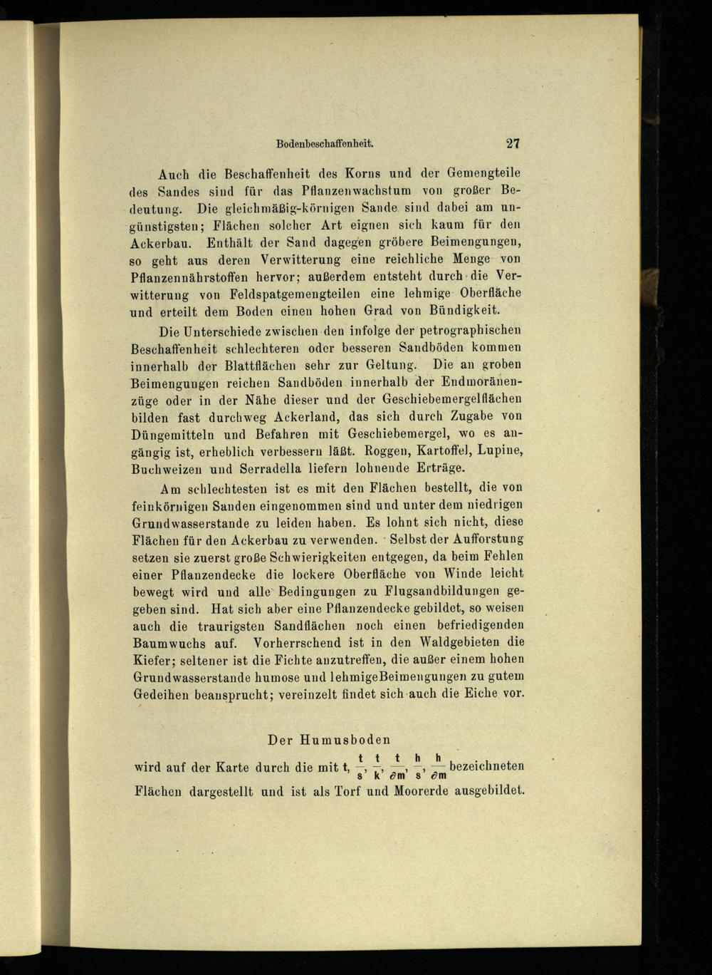 Die Unterschiede zwischen den infolge der petrographischen Beschaffenheit schlechteren oder besseren Sandböden kommen innerhalb der Blattflächen sehr zur Geltung. Die an groben Beimengungen reichen Sandböden innerhalb der Endmoränenzüge oder in der Nähe dieser und der Geschiebemergelflächen bilden fast durchweg Ackerland, das sich durch Zugabe von Düngemitteln und Befahren mit Geschiebemergel, wo es angängig ist, erheblich verbessern läßt. Roggen, Kartoffel, Lupine, Buchweizen und Serradella liefern lohnende Erträge.
