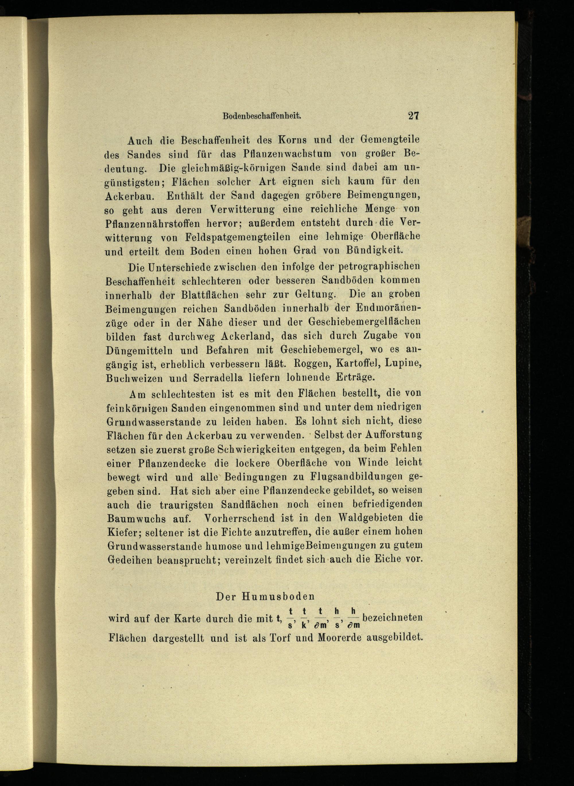 Auch die Beschaffenheit des Korns und der Gemengteile des Sandes sind für das Pflanzenwachstum von großer Bedeutung. Die gleichmäßig-körnigen Sande. sind dabei am ungünstigsten; Flächen solcher Art eignen sich kaum für den Ackerbau. Enthält der Sand dagegen gröbere Beimengungen, so geht aus deren Verwitterung eine reichliche Menge: von Pflanzennährstoffen hervor; außerdem entsteht durch:die Verwitterung von Feldspatgemengteilen eine lehmige: Oberfläche und erteilt dem Boden einen hohen Grad von Bündigkeit.