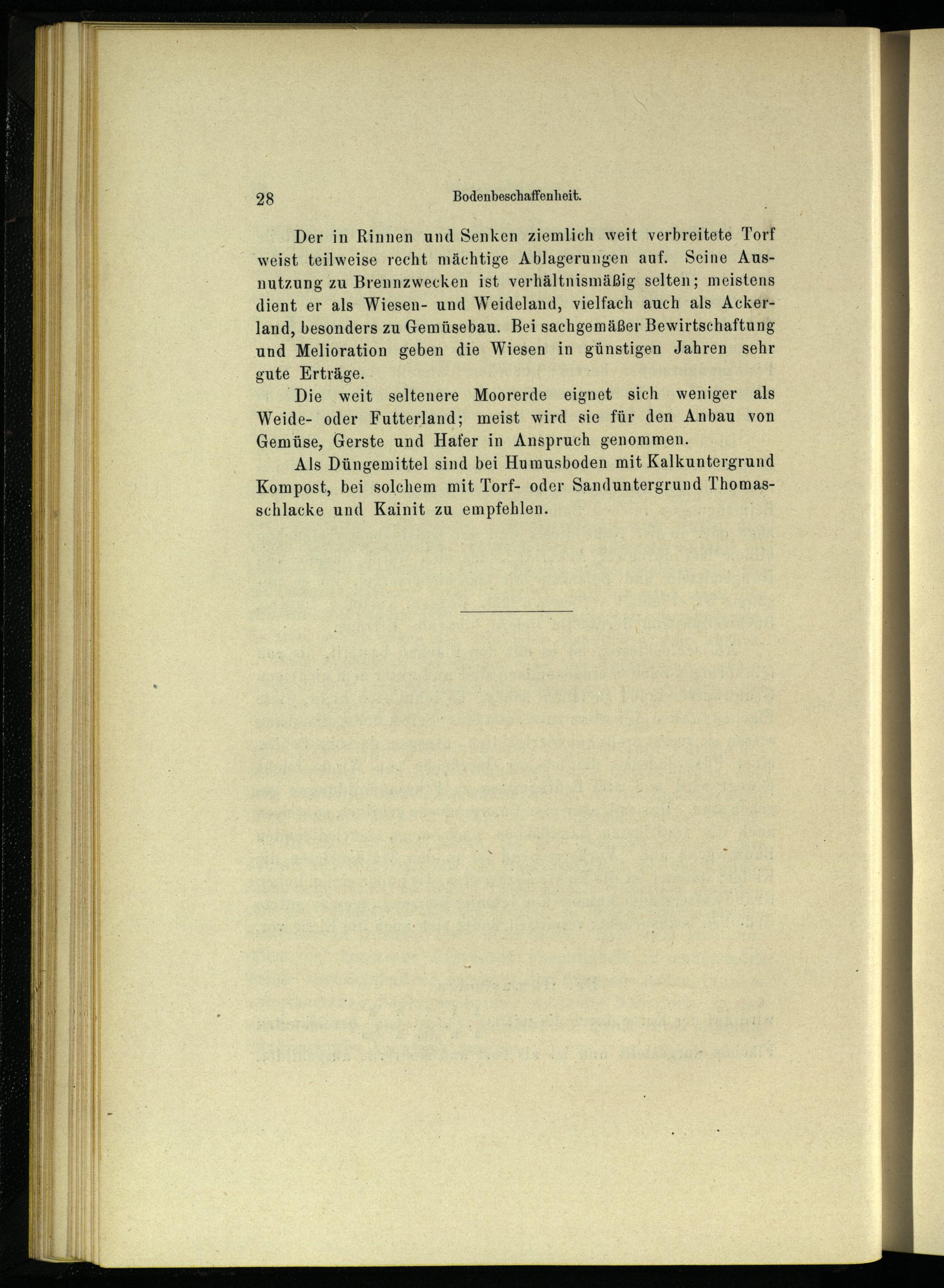 Der in Rinnen und Senken ziemlich weit verbreitete Torf weist teilweise recht mächtige Ablagerungen auf. Seine Ausnutzung zu Brennzwecken ist verhältnismäßig selten; meistens dient er als Wiesen- und Weideland, vielfach auch als Ackerland, besonders zu Gemüsebau. Bei sachgemäßer Bewirtschaftung und Melioration geben die Wiesen in günstigen Jahren sehr gute Erträge.