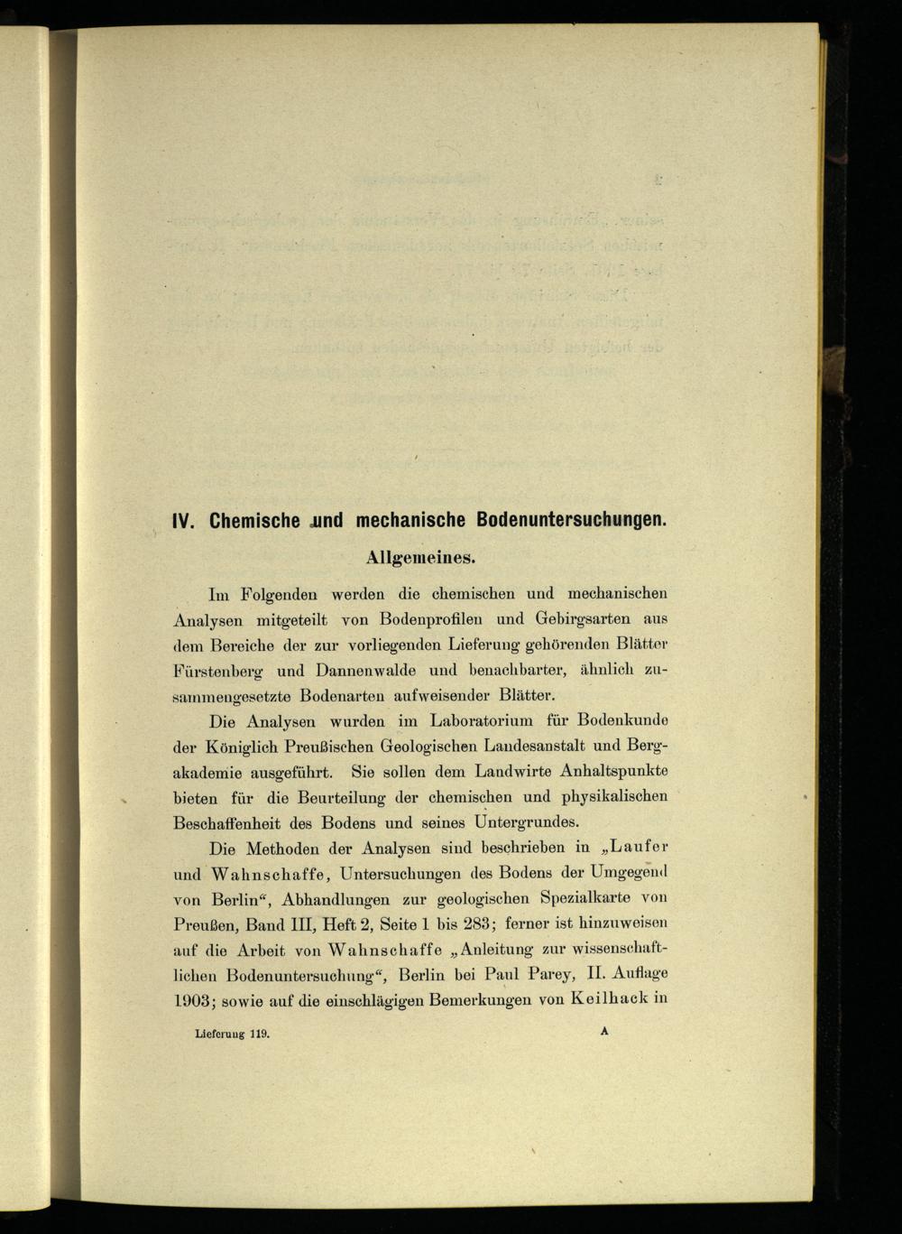 Im Folgenden werden die chemischen und mechanischen Analysen mitgeteilt von Bodenprofilen und Gebirgsarten aus dem Bereiche der zur vorliegenden Lieferung gehörenden Blätter Fürstenberg und Dannenwalde und benachbarter, ähnlich zusammengesetzte Bodenarten aufweisender Blätter.