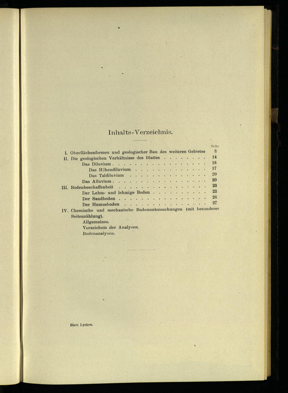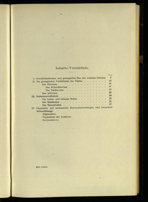 „. Oberflächenformen und geologischer Bau des weiteren Gebietes . Die geologischen Verhältnisse des Blattes.....++ Das Diluvium.. Das Höhendiluavium Das Taldiluvium Das Alltıylum. . Bodenbeschaffenheit.... Der Lehm- und lehmige Boden Der Sandboden Der Humusboden.... . Chemische und mechanische odenuntersuchungen Seitenzählung). Allgemeines. Verzeichnis der Analysen. Bodenanalysen.