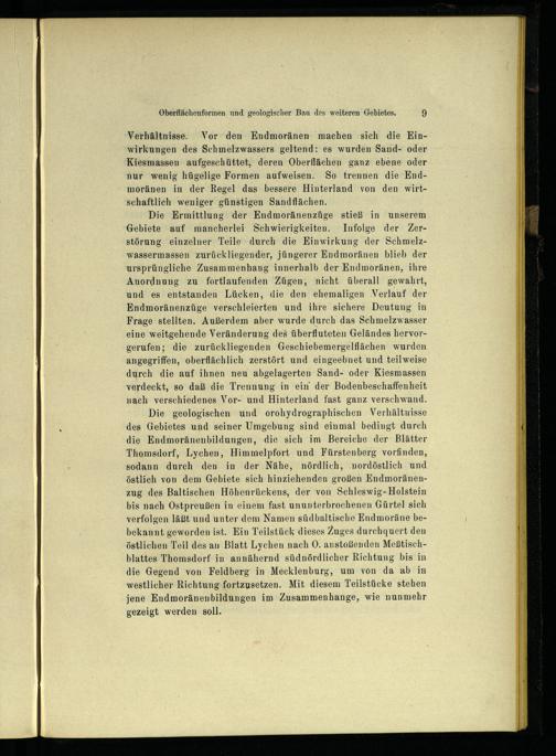 Die geologischen und orohydrographischen Verhältnisse des Gebietes und seiner Umgebung sind einmal bedingt durch die Endmoränenbildungen, die sich im Bereiche der Blätter Thomsdorf, Lychen , Himmelpfort und Fürstenberg vorfinden, sodann durch den in der Nähe, nördlich, nordöstlich und östlich von dem Gebiete sich hinziehenden großen Endmoränenzug des Baltischen Höhenrückens, der von Schleswig- Holstein bis nach Ostpreußen in einem fast ununterbrochenen Gürtel sich verfolgen 1äßt und unter dem Namen südbaltische Endmoräne bebekannt geworden ist. Ein Teilstück dieses Zuges durchquert den östlichen Teil des an Blatt Lychen nach O. anstoßenden Meßtischblattes Thomsdorf in annähernd südnördlicher Richtung bis in die Gegend von Feldberg in Mecklenburg , um von da ab in westlicher Richtung fortzusetzen. Mit diesem Teilstücke stehen jene Endmoränenbildungen im Zusammenhange, wie nunmehr gezeigt werden soll.
