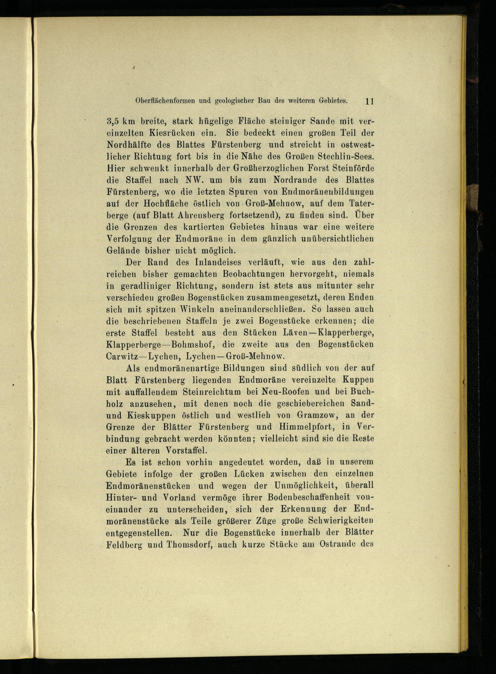 3,5 km breite, stark hügelige Fläche steiniger Sande mit vereinzelten Kiesrücken ein. Sie bedeckt einen großen Teil der Nordhälfte des Blattes Fürstenberg und streicht in ostwestlicher Richtung fort bis in die Nähe des Großen Stechlin -Sees. Hier schwenkt innerhalb der Großherzoglichen Forst Steinförde die Staffel nach NW. um bis zum Nordrande des Blattes Fürstenberg , wo die letzten Spuren von Endmoränenbildungen auf der Hochfläche östlich von. Groß-Mehnow, auf dem Taterberge(auf Blatt Ahrensberg fortsetzend), zu finden sind. Über die Grenzen des kartierten Gebietes hinaus war eine weitere Verfolgung der Endmoräne in dem gänzlich unübersichtlichen Gelände bisher nicht möglich.