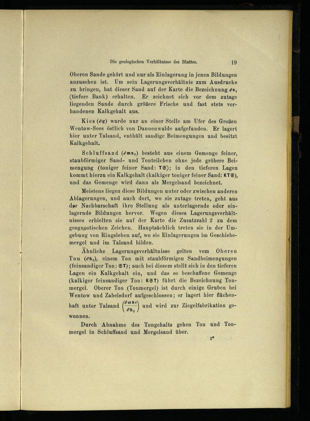 Ähnliche Lagerungsverhältnisse gelten. vom Oberen Ton(öh,), einem Ton mit staubförmigen Sandbeimengungen (feinsandiger Ton: ST); auch bei diesem stellt sich in den tieferen Lagen ein Kalkgehalt ein, und das so beschaffene Gemenge (kalkiger feinsandiger Ton: KST) führt die Bezeichnung Tonmergel. Oberer Ton(Tonmergel) ist durch einige Gruben bei Wentow und Zabelsdorf aufgeschlossen; er lagert hier. flächen