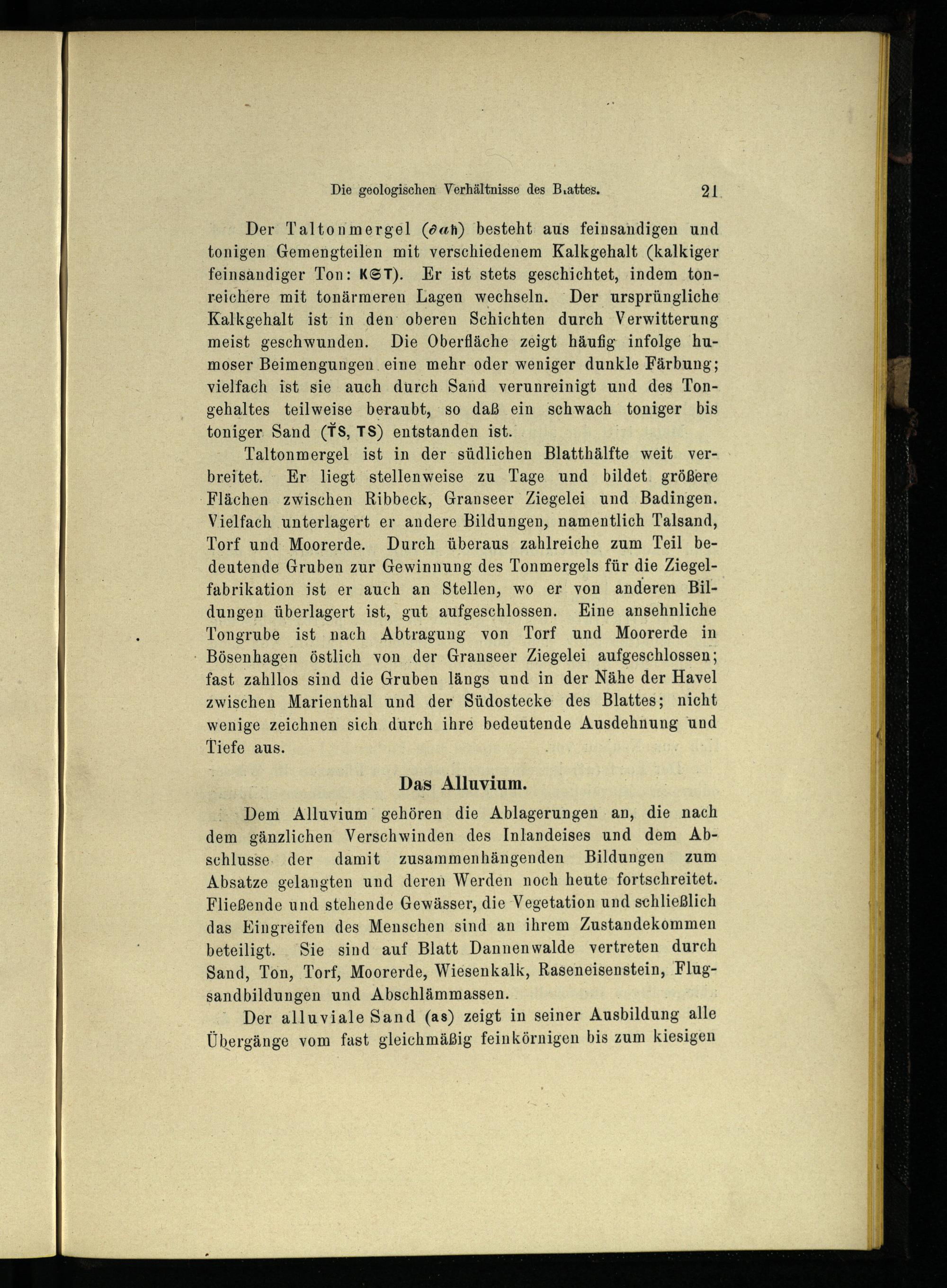 Taltonmergel ist in der südlichen Blatthälfte weit verbreitet. Er liegt stellenweise zu Tage und bildet. größere Flächen zwischen Ribbeck, Granseer Ziegelei und Badingen . Vielfach unterlagert er andere Bildungen, namentlich Talsand, Torf und Moorerde. Durch überaus zahlreiche zum Teil bedeutende Gruben zur Gewinnung des Tonmergels für die Ziegelfabrikation ist er auch an Stellen, wo er von anderen Bildungen überlagert ist, gut aufgeschlossen. Kine ansehnliche Tongrube ist nach Abtragung von Torf und Moorerde in - Bösenhagen östlich von der Granseer Ziegelei aufgeschlossen; fast zahllos sind die Gruben längs und in der Nähe der Havel zwischen Marienthal und der Südostecke des Blattes; nicht wenige zeichnen sich durch ihre bedeutende Ausdehnung und Tiefe aus.