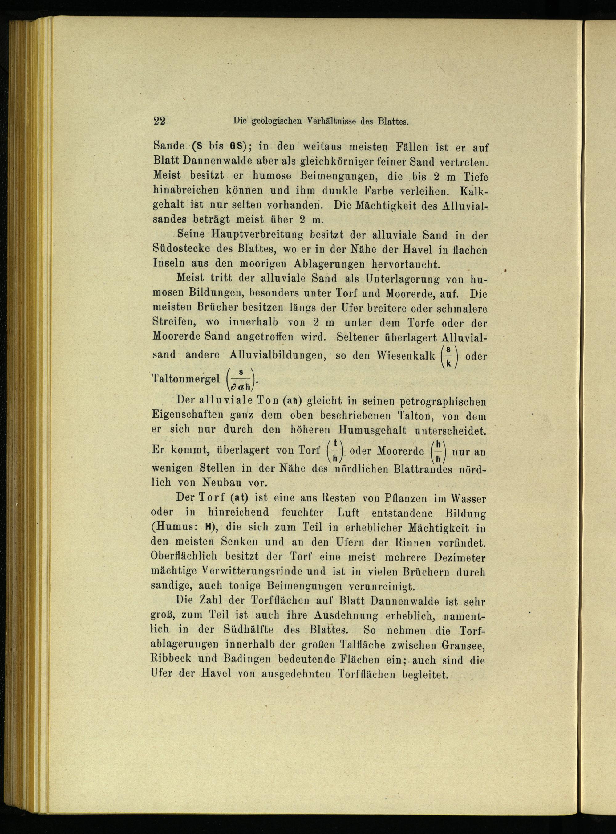 Der Torf(at) ist eine aus Resten von Pflanzen im Wasser oder in hinreichend feuchter Luft entstandene Bildung (Humus: H), die sich zum Teil in erheblicher Mächtigkeit in den. meisten Senken und an den Ufern der Rinnen vorfindet. Oberflächlich besitzt der Torf eine meist mehrere Dezimeter mächtige Verwitterungsrinde und ist in vielen Brüchern durch sandige, auch tonige Beimengungen verunreinigt.