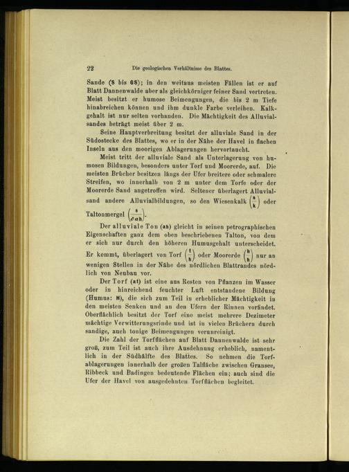 Meist tritt der alluviale Sand als Unterlagerung von humosen Bildungen, besonders unter Torf und Moorerde, auf. Die meisten Brücher besitzen längs der Ufer breitere oder schmalere Streifen, wo innerhalb von 2 m unter dem Torfe oder der Moorerde Sand angetroffen wird. Seltener überlagert Alluvial