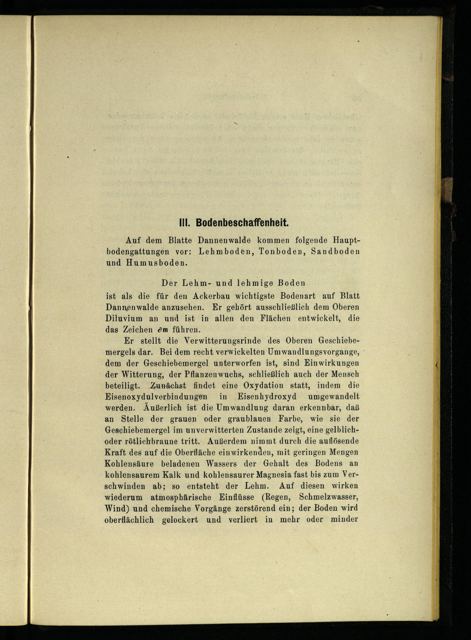 Er stellt die Verwitterungsrinde des Oberen Geschiebemergels dar. Bei dem recht verwickelten Umwandlungsvorgange, dem der Geschiebemergel unterworfen ist, sind Einwirkungen - der Witterung, der Pflanzenwuchs, schließlich auch der Mensch beteiligt. Zunächst findet eine Oxydation statt, indem die Eisenoxydulverbindungen in ‚Eisenhydroxyd umgewandelt werden. Äußerlich ist die Umwandlung daran erkennbar, daß an Stelle der grauen oder graublauen Farbe, wie sie der Geschiebemergel im unverwitterten Zustande zeigt, eine gelblichoder rötliehbraune tritt. Außerdem nimmt durch die auflösende Kraft des auf die Oberfläche einwirkenden, mit geringen Mengen Kohlensäure beladenen Wassers der Gehalt des Bodens an kohlensaurem Kalk und kohlensaurer Magnesia fast bis zum Verschwinden ab; so entsteht der Lehm. Auf diesen wirken wiederum atmosphärische Einflüsse(Regen, Schmelzwasser, Wind) und chemische Vorgänge zerstörend ein; der Boden wird oberflächlich gelockert und verliert in mehr oder minder