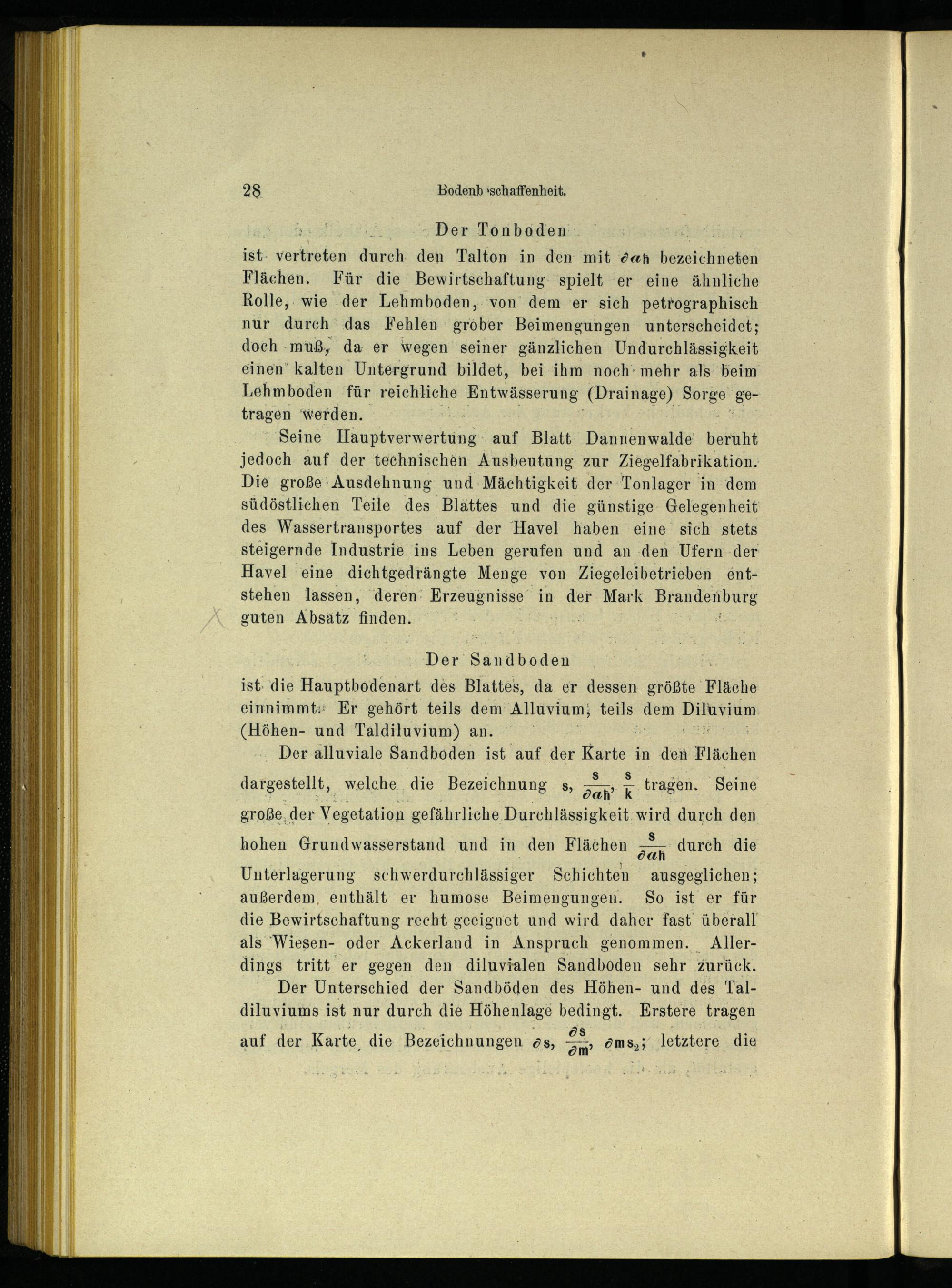 ist. vertreten durch. den Talton in den mit dah bezeichneten Flächen. Für die‘ Bewirtschaftung spielt er eine ähnliche Rolle, wie der Lehmboden, von’ dem er sich petrographisch nur durch‘ das Fehlen grober Beimengungen unterscheidet; doch muß, da er wegen‘seiner gänzlichen Undurchlässigkeit einen’ kalten Untergrund bildet, bei ihm noch‘mehr als beim Lehmboden für reichliche Entwässerung(Drainage) Sorge getragen werden.
