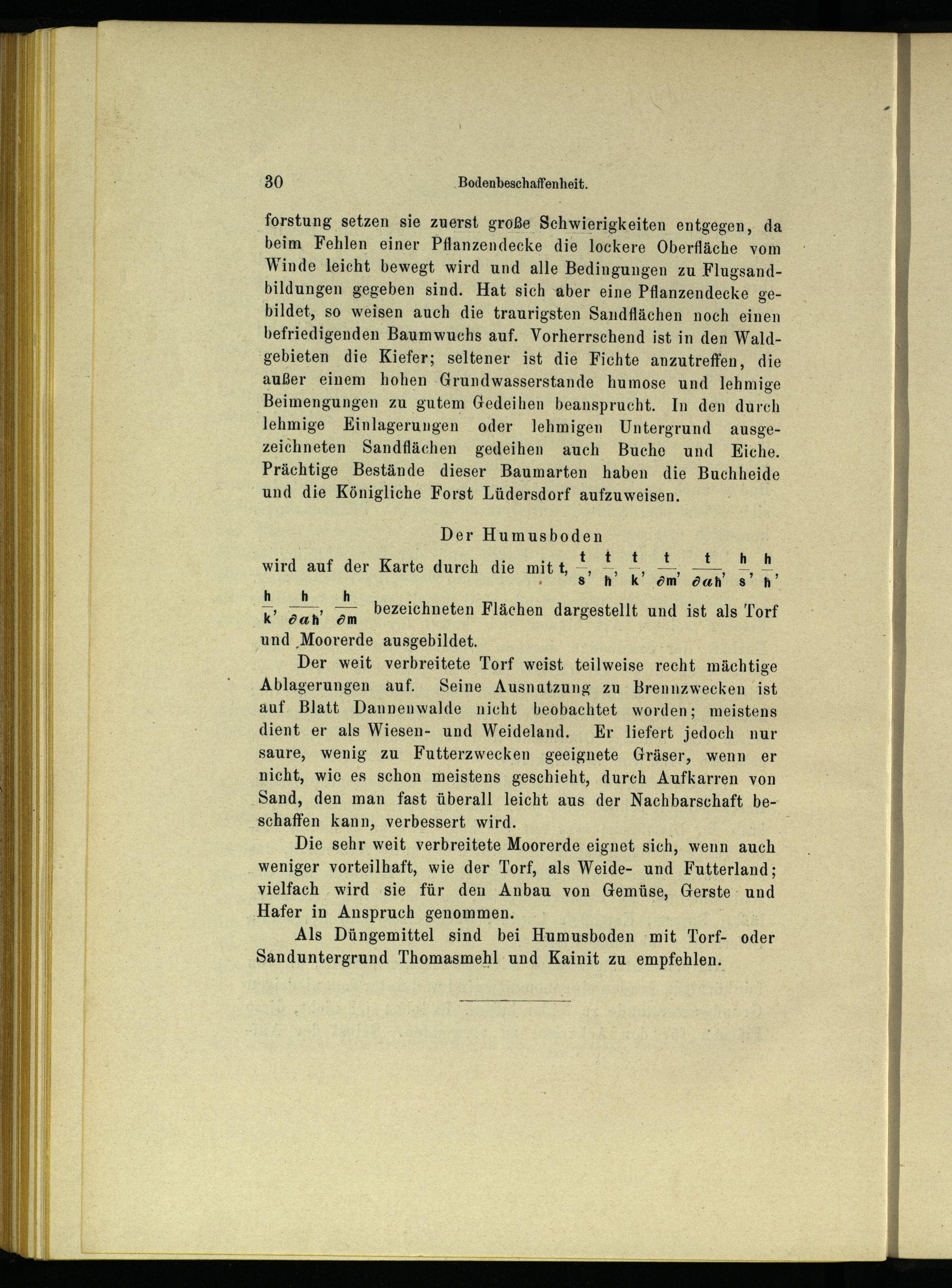 forstung setzen sie zuerst große Schwierigkeiten entgegen, da beim Fehlen einer Pflanzendecke die lockere Oberfläche vom Winde leicht bewegt wird und alle Bedingungen zu Flugsandbildungen gegeben sind. Hat sich aber eine Pflanzendecke gebildet, so weisen auch die traurigsten Sandflächen noch einen befriedigenden Baumwuchs auf. Vorherrschend ist in den Waldgebieten die Kiefer; seltener ist die Fichte anzutreffen, die außer einem hohen Grundwasserstande humose und lehmige Beimengungen zu gutem Gedeihen beansprucht. In den durch lehmige KEinlagerungen oder lehmigen Untergrund ausgezeichneten Sandflächen gedeihen auch Buche und Eiche. Prächtige Bestände dieser Baumarten haben die Buchheide und die Königliche Forst Lüdersdorf aufzuweisen.