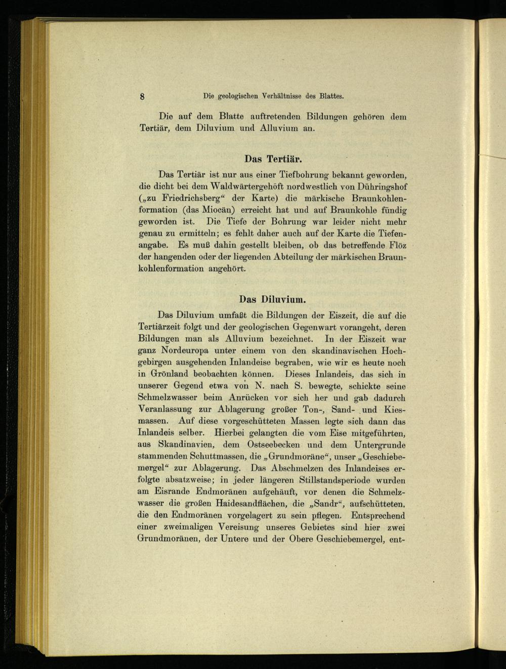 Das Tertiär ist nur aus einer Tiefbohrung bekannt geworden, die dicht bei dem Waldwärtergehöft nordwestlich von Dühringshof („zu Friedrichsberg“ der Karte) die märkische Braunkohlenformation(das Miocän) erreicht hat und auf Braunkohle fündig geworden ist. Die Tiefe der Bohrung war leider nicht mehr genau zu ermitteln; es fehlt daher auch auf der Karte die Tiefenangabe. Es muß dahin gestellt bleiben, ob das betreffende Flöz der hangenden oder der liegenden Abteilung der märkischen Braunkohlenformation angehört.