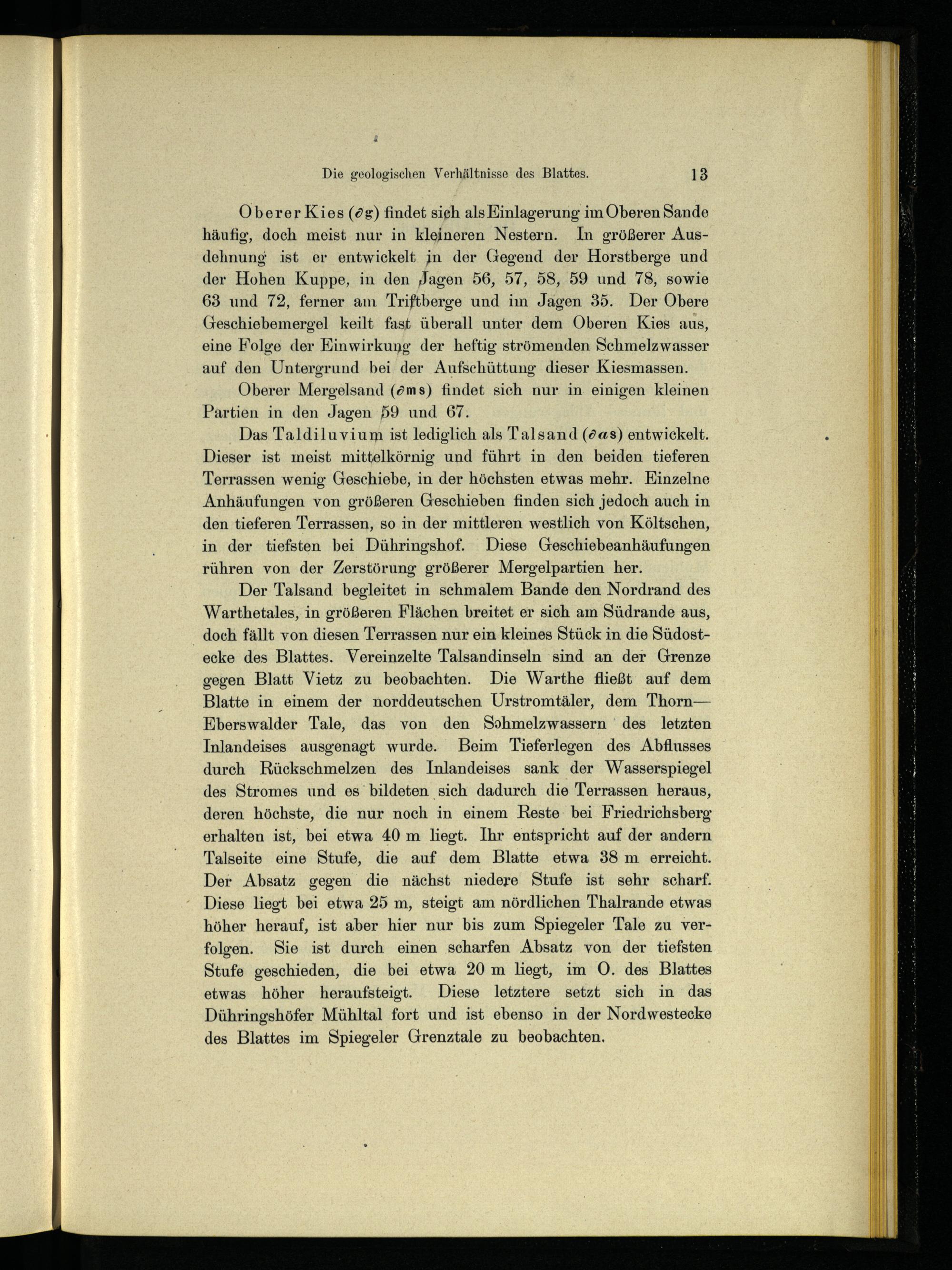 Der Talsand begleitet in schmalem Bande den Nordrand des Warthetales, in größeren Flächen breitet er sich am Südrande aus, doch fällt von diesen Terrassen nur ein kleines Stück in die Südostecke des Blattes. Vereinzelte Talsandinseln sind an der Grenze gegen Blatt Vietz zu beobachten. Die Warthe fließt auf dem Blatte in einem der norddeutschen Urstromtäler, dem Thorn— Eberswalder Tale, das von den Sohmelzwassern des letzten Inlandeises ausgenagt wurde. Beim Tieferlegen des Abflusses durch Rückschmelzen des Inlandeises sank der Wasserspiegel des Stromes und es bildeten sich dadurch die Terrassen heraus, deren höchste, die nur noch in einem Reste: bei Friedrichsberg erhalten ist, bei etwa 40 m liegt. Ihr entspricht auf der andern Talseite eine Stufe, die auf dem Blatte etwa 38 m. erreicht. Der Absatz gegen die nächst niedere Stufe ist sehr scharf. Diese liegt bei etwa 25 m, steigt am nördlichen T’halrande etwas höher herauf, ist aber hier nur bis zum Spiegeler Tale zu verfolgen. Sie ist durch einen scharfen Absatz von der tiefsten Stufe geschieden, die bei etwa 20m liegt, im O. des Blattes etwas höher heraufsteigt. Diese letztere setzt sich in das Dühringshöfer Mühltal fort und ist ebenso in der Nordwestecke des Blattes im Spiegeler Grenztale zu beobachten,