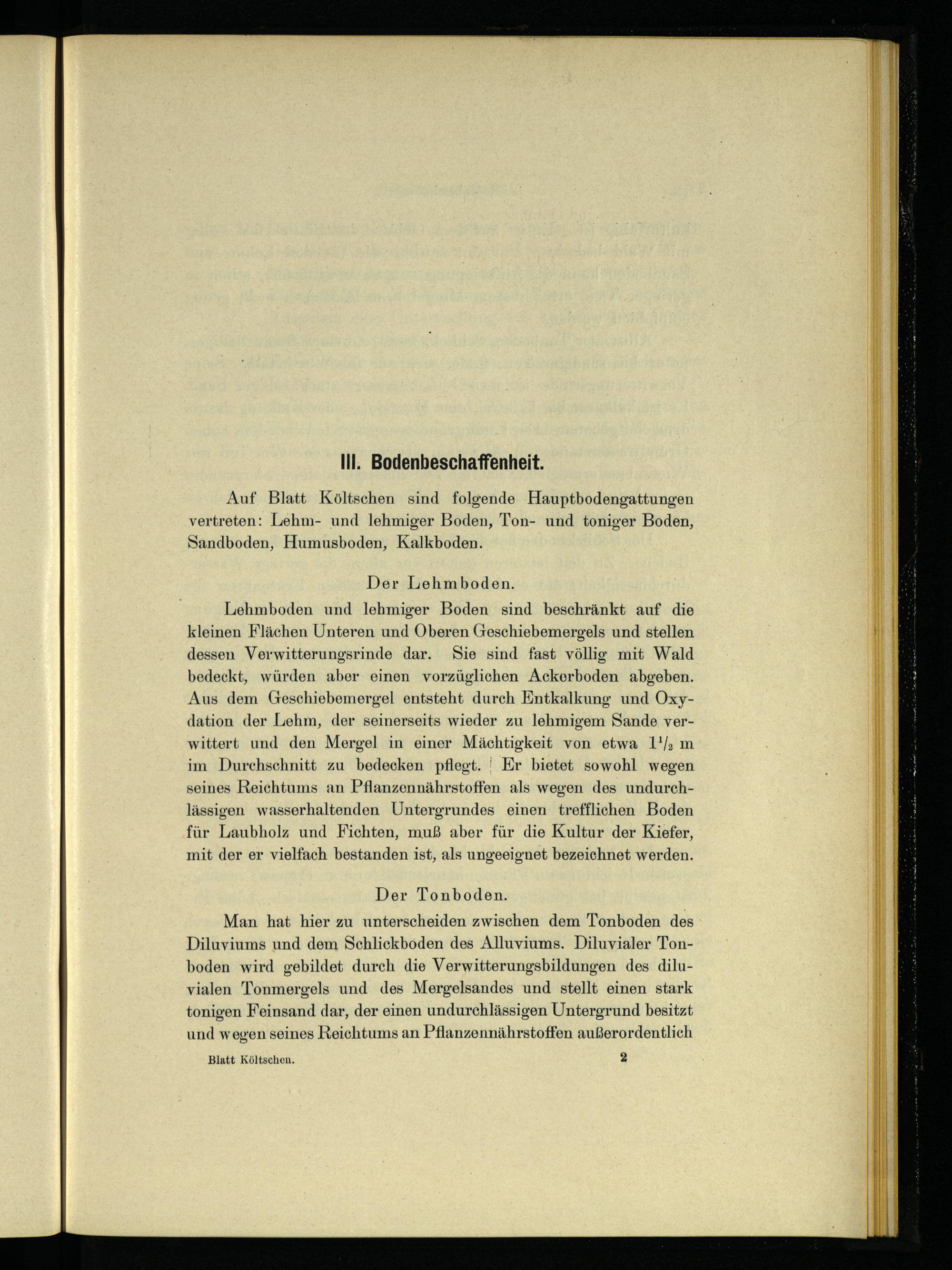 Lehmboden und lehmiger Boden sind beschränkt auf die kleinen Flächen Unteren und Oberen Geschiebemergels und stellen dessen Verwitterungsrinde dar. Sie sind fast völlig mit Wald bedeckt, würden aber einen vorzüglichen Ackerboden abgeben. Aus dem Geschiebemergel entsteht durch Entkalkung und Oxydation der Lehm, der seinerseits wieder zu lehmigem Sande verwittert und den Mergel in einer Mächtigkeit von etwa 1! m im Durchschnitt zu bedecken pflegt.' Er bietet sowohl wegen seines Reichtums an Pflanzennährstoffen als wegen des undurchlässigen wasserhaltenden Untergrundes einen trefflichen Boden für Laubholz und Fichten, muß aber für die Kultur der Kiefer, mit der er vielfach bestanden ist, als ungeeignet bezeichnet werden.