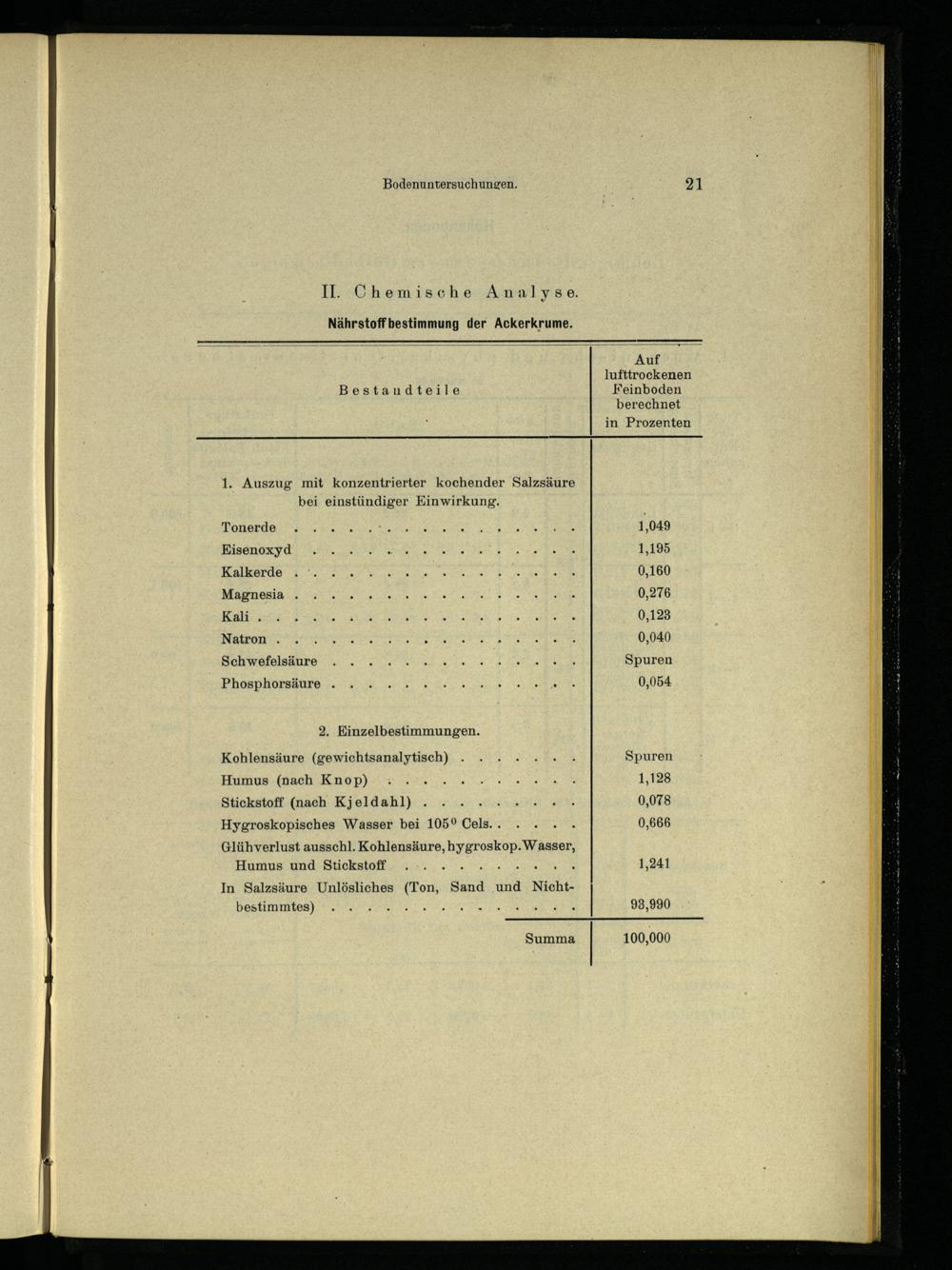 Hygroskopisches Wasser bei 105° Cels.. Glühverlust ausschl. Kohlensäure, hygroskop. Wasser, Humus und Stickstoff 2. N In Salzsäure Unlösliches(Ton, Sand und Nicht