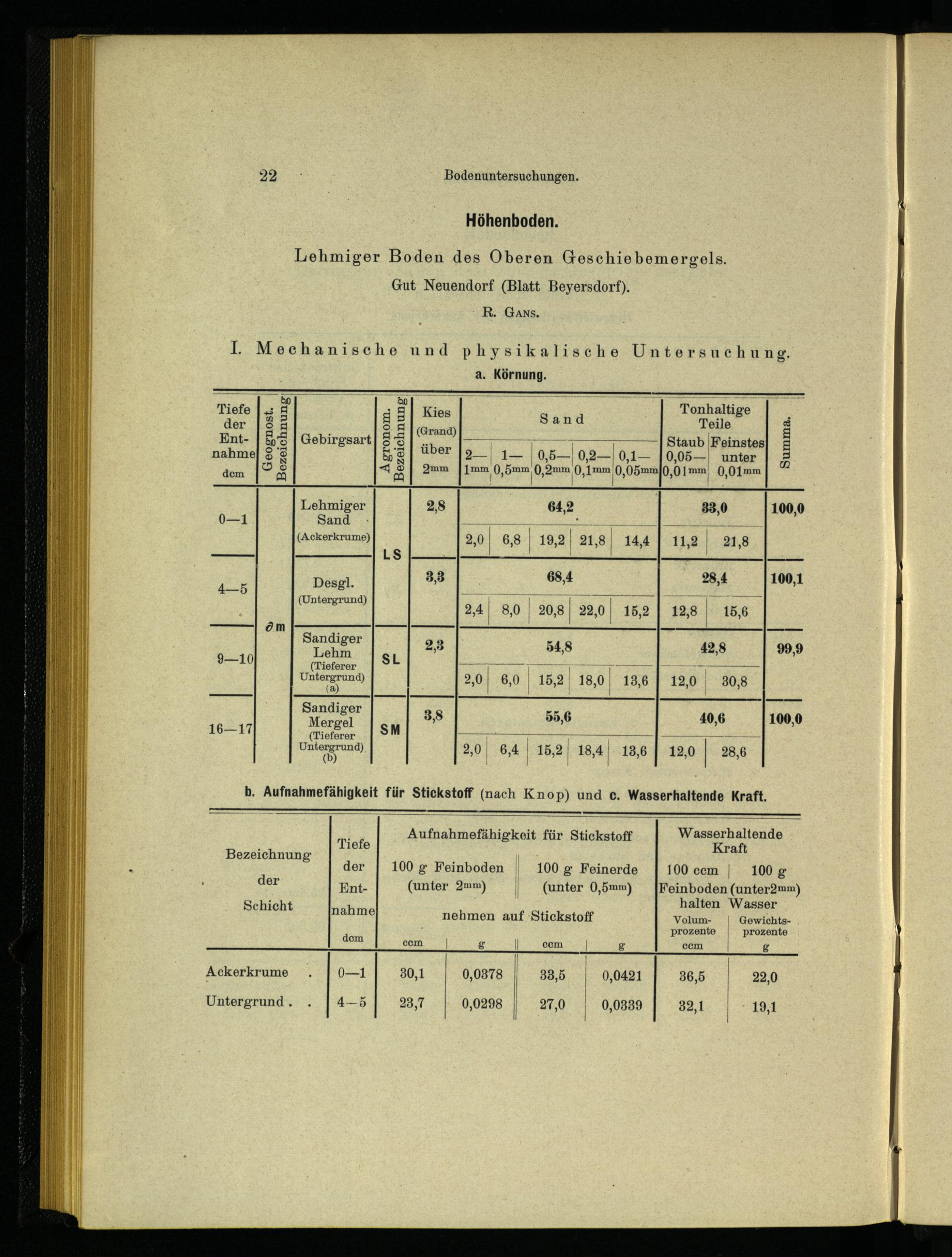 a. Körnung. Miefo|: DI Di S Tonhaltige De= 8 g 3] Kies Sand Teile 5 er[S& S. 8|(Grana Ent- rs Gebirgsart 58 De MA——— Staub|Feinstes£ nahmel& 8&S er a 1| 0,5—) 0,2—| 0,1— 10,05—!/ unter| 3 am[SS AS] mm 1mm 0,5mm 0,2mm 0, 1m 0,05mm[0,01mm 0,01mm Lehmiger 2,8 64,2 33,0 100,0 0—1 Sand- z En 8 A (Ackerkrume) 2,0| 6,8| 19,2| 21,8| 14,4| 11,2| 21,8 ————l LS A— Despl 8,8 68,4 28,4 100,1 4—5. m S m tern 2 A| 8, 0| 20,8| 22,0 0}| 15,2| 128| 15,6 Sandiger 23 54,8 42,8 99,9 Lehm m 54,,, 9—10(Tieferer SL SEE pr GEGEN Untergrund) 2,0| 6,0| 15,2| 18,0| 18,6| 12,0| 30,8 E)||| Km 3,8 55,6 40,6 100,0 1817(Tieferer SM IT TCT EEE Anm VA TR Untergrund) 2,0 6,4 15,2 18,4 13,6 12,0| 28,6