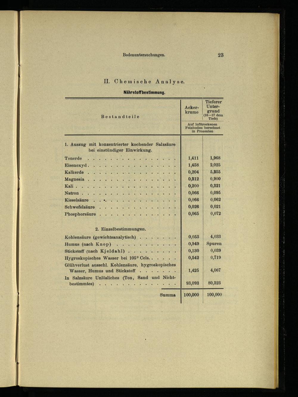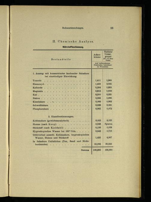 Acker-| Unterkrume grund Bestandteile een “Auf lufttrockenen Feinboden berechnet in Prozenten 1. Auszug mit konzentrierter kochender Salzsäure bei einstündiger Einwirkung.| Tonerde) 1,411 1,968 Eisenoxyd. 1,458 2,025 Kalkerde 0,204| 5,855 Magnesia. 0,812| 0,900 Kali. 0,200 0,821 Natron. 0,066 0,095 Kieselsäure..*. 0,066 0,062 Schwefelsäure 0,026| 0,021 Phosphorsäure 0,065 0,072 2. Einzelbestimmungen. Kohlensäure(gewichtsanalytisch) 0,053 4,088 Humus(nach Knop) 0,949| Spuren Stickstoff(nach Kjeldahl) 0,180 0,089 Hygroskopisches Wasser bei 105° Cels.. 0,542| 0,719 Glühverlust ausschl. Kohlensäure, Hy ROAD SCH| Wasser, Humus und Stickstoff. 1,425|. 4,067 In Salzsäure Unlösliches(Ton, Sand und Nicht-| bestimmtes) ee 93,093| 80,328 Summa| 100,000| 100,000
